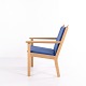 Lounge chair model GE 284 designed by Hans J. Wegner and produced by Getama. Made with a solid oak frame and loose cushions upholstered in blue wool. A classic Wegner design offering comfort and a compact form suitable for both modern and traditional interiors.