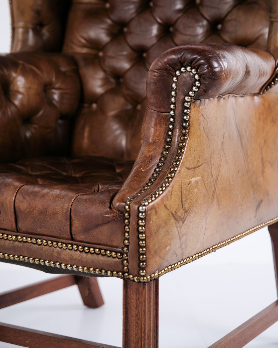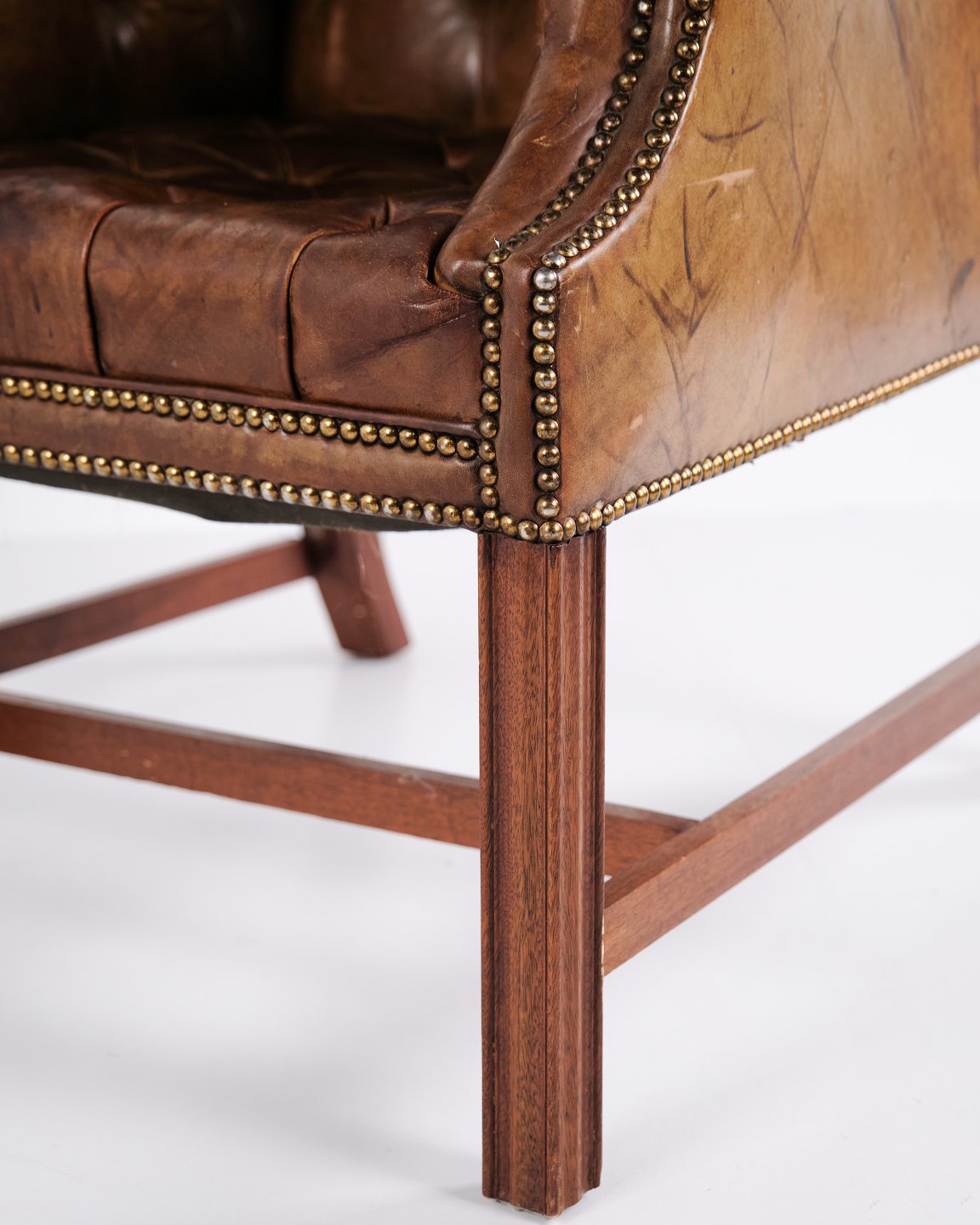 High-quality wingback armchair from around 1910 in brown original leather. Classic high-back model with pronounced wings and solid frame. Includes matching footstool. Designed in the style of the George III period with well-preserved original leather and attractive patina.