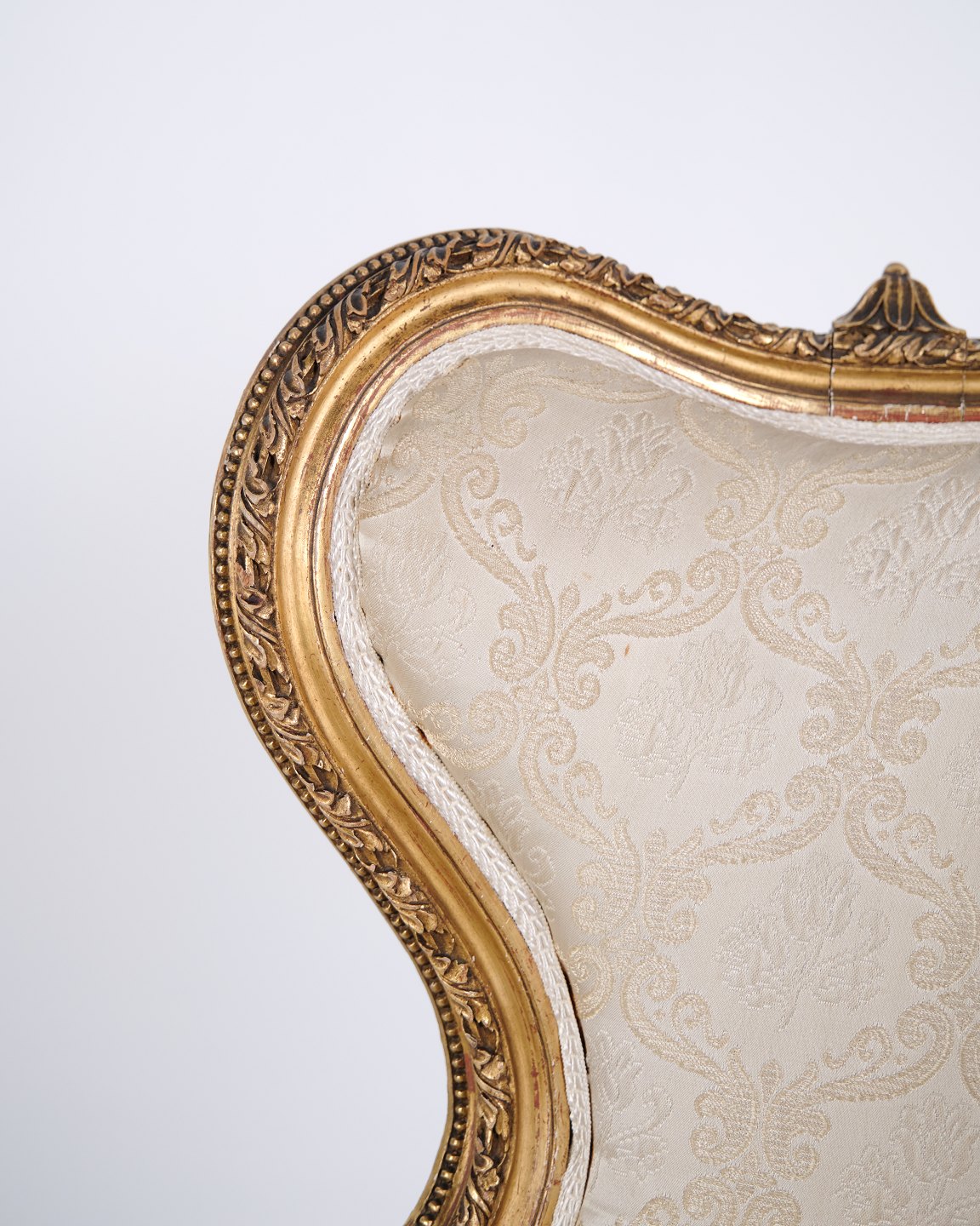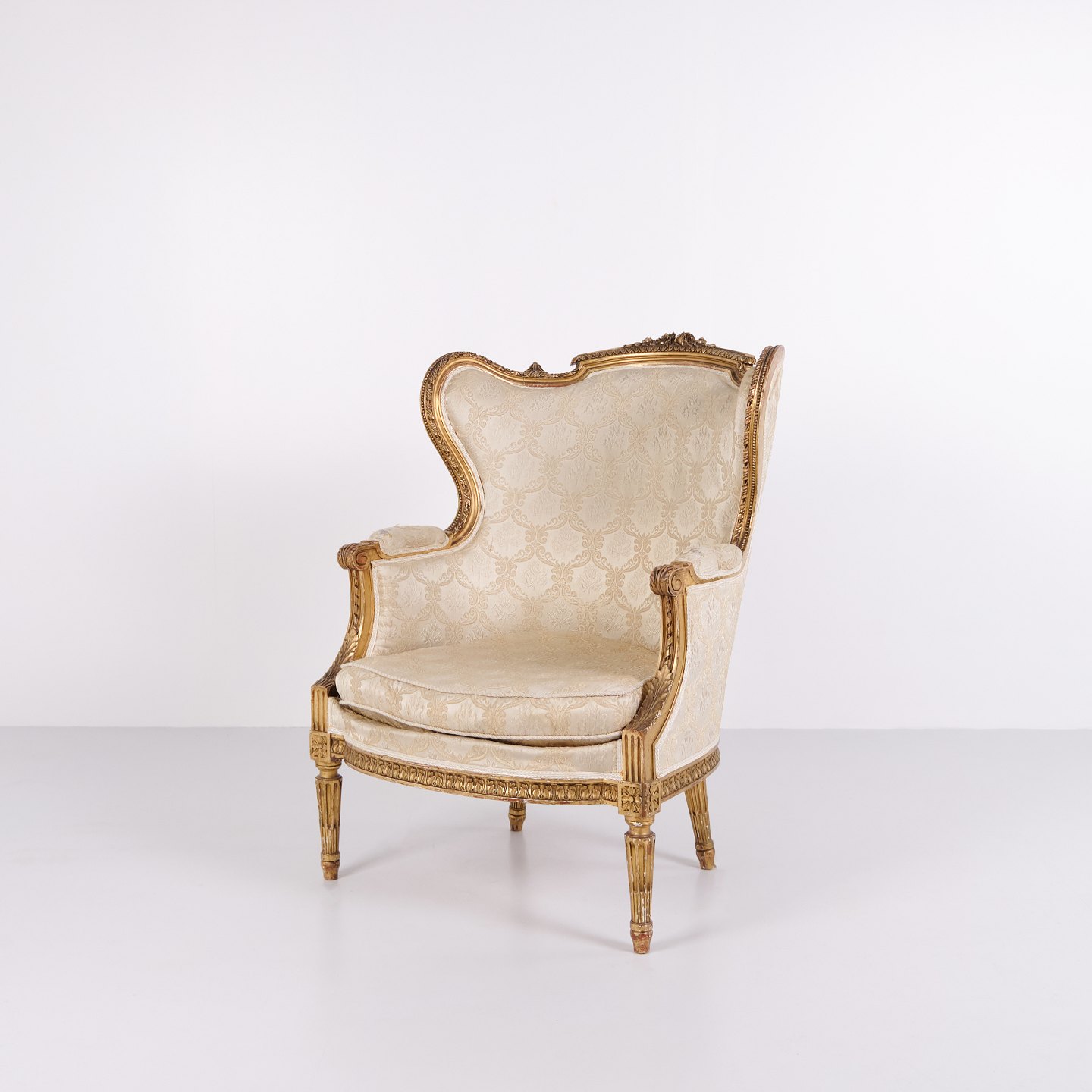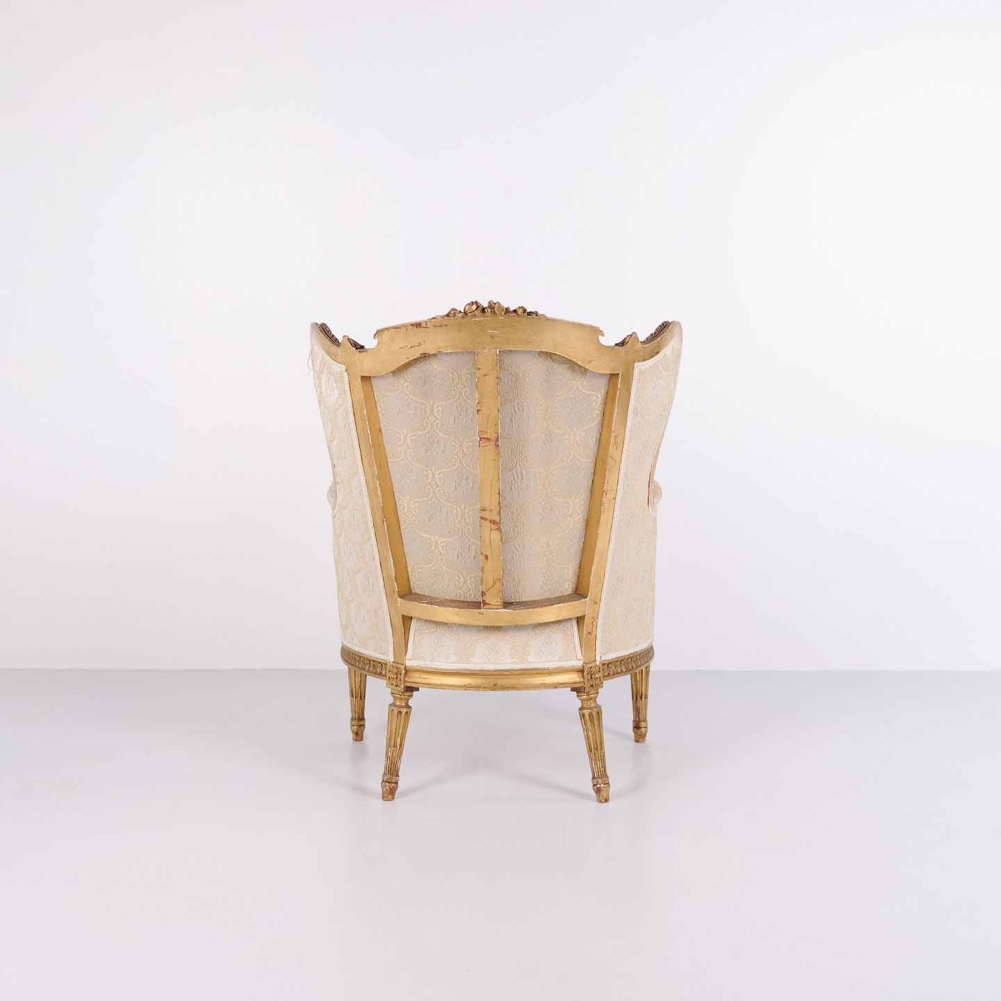 Antiker Bergère Sessel aus den 1860er Jahren im Louis XVI Stil. Vergoldetes Holz und heller Polsterstoff.