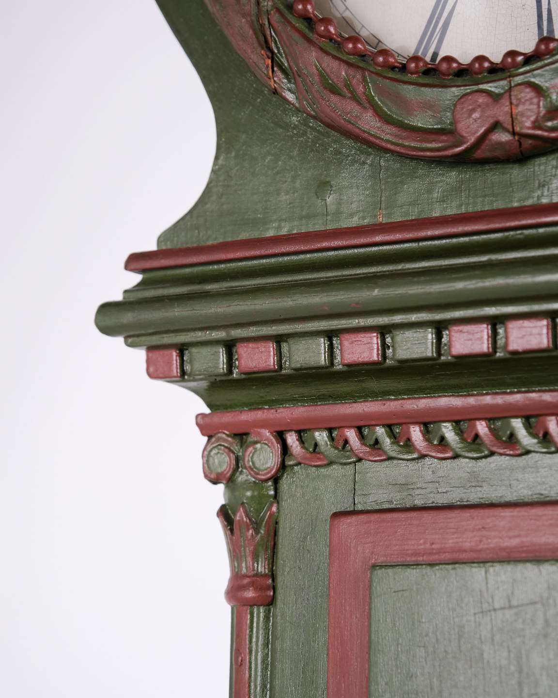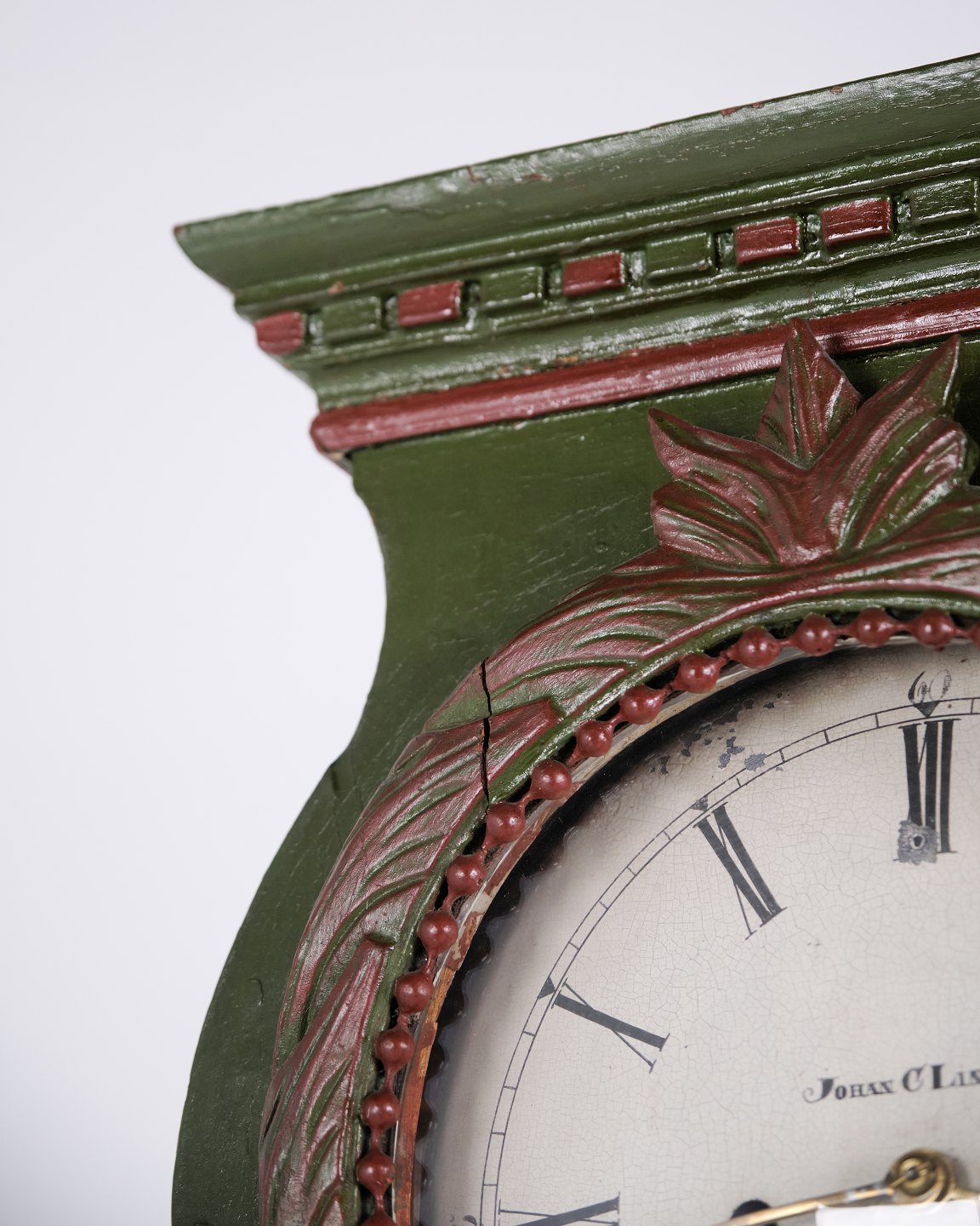 Bornholmeruhr “Frøken”-Modell aus den 1860er Jahren, handbemalt mit geschnitzten Details in grüner/roter Bemalung. Antike Bornholmer Uhr aus dem 19. Jahrhundert.