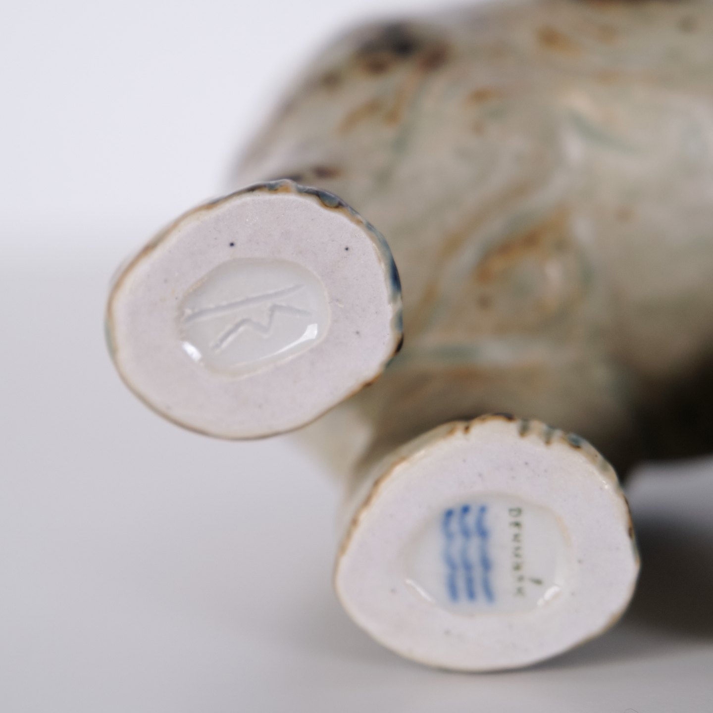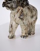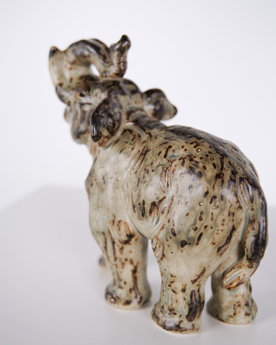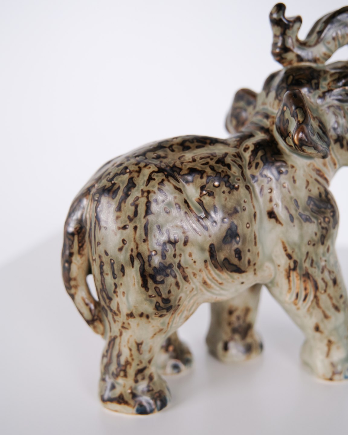 Steinzeugfigur in Form eines stehenden Elefanten, Modell 21517, entworfen von Knud Kyhn für Royal Copenhagen. Die Figur wurde aus Steinzeug gefertigt und gehört zu Knud Kyhns bekannten Tierdarstellungen, die bei Royal Copenhagen vor allem ab den 1930er-Jahren produziert wurden. Kyhns Arbeiten sind für ihre klare Formgebung und materialbetonte Ausführung bekannt und werden von Sammlern dänischer Keramik geschätzt.