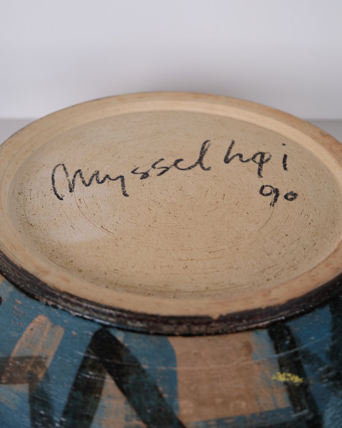 Unique ceramic dish executed and signed by the Danish ceramic artist Per Weiss (b. 1953) in 1990. The dish is decorated in colorful tones with a motif of Mysselhøj, an ancient burial mound located about 1 km west of Gammel Lejre near Roskilde, where both Per and Lene Weiss previously lived. The motif is inspired by the historic landscape surrounding Lejre and is executed as a unique artistic piece.