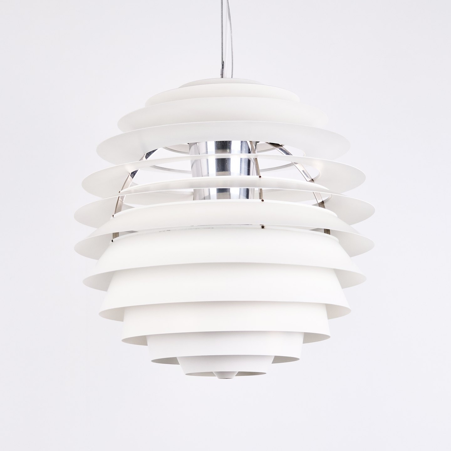Iconic pendant, PH Louvre (formerly called PH Kugle), designed by Poul Henningsen in 1957 for the Adventist Church in Skodsborg. The lamp is constructed of 13 lamellas mounted on an internal structure, ensuring a soft and glare-free light. The spherical design creates an even light distribution and a sculptural expression.