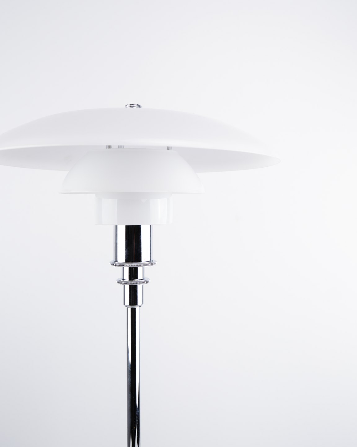 PH 3/2 table lamp designed by Poul Henningsen and produced by Louis Poulsen. The lamp is made with shades in white opal glass, ensuring a soft and glare-free light. The iconic three-shade system is developed for optimal light distribution and is a central element in Henningsen’s design philosophy.