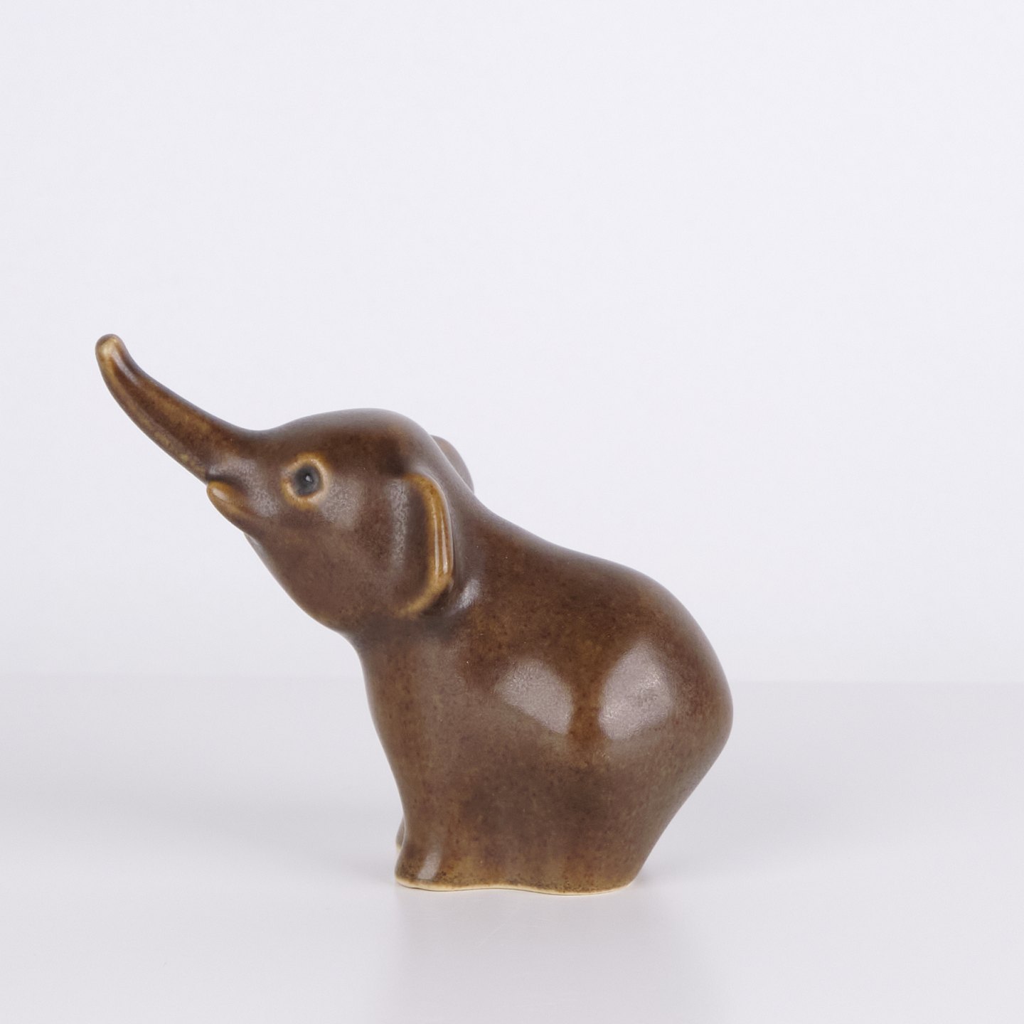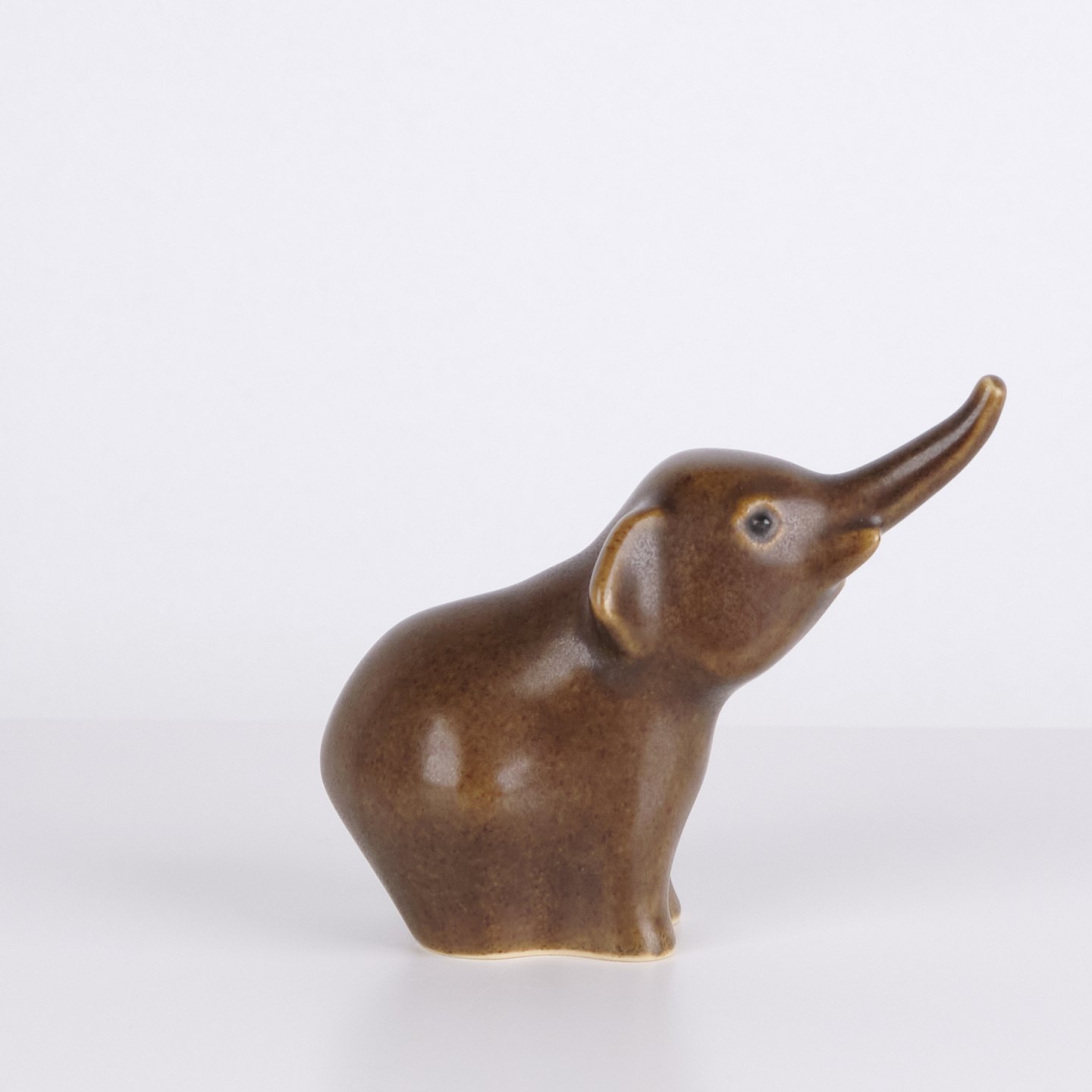 Elephant figure by Knud Basse made in brown glazed ceramic. The figure is modeled with raised trunk and rounded forms, creating a lively and decorative expression. A classic example of Danish animal ceramics, where simple lines and characterful motifs are central. Sought-after figure among collectors of Knud Basse and Danish ceramics.