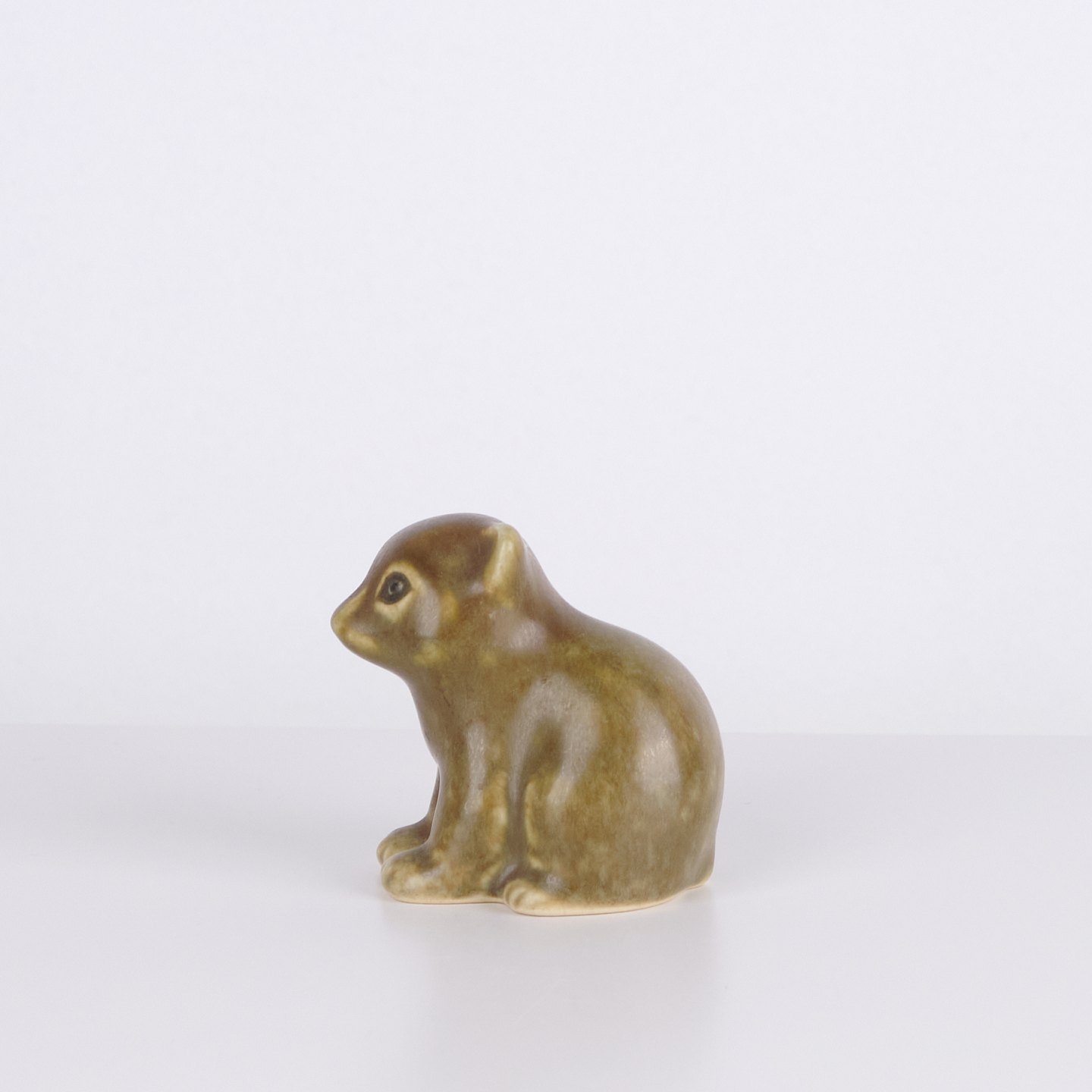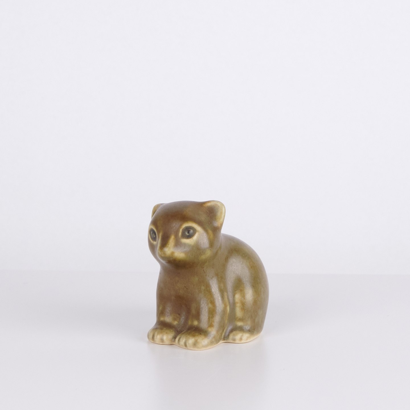 Cat figure by Knud Basse made in brown glazed ceramic. The model shows a seated cat with accentuated eyes and rounded body form.