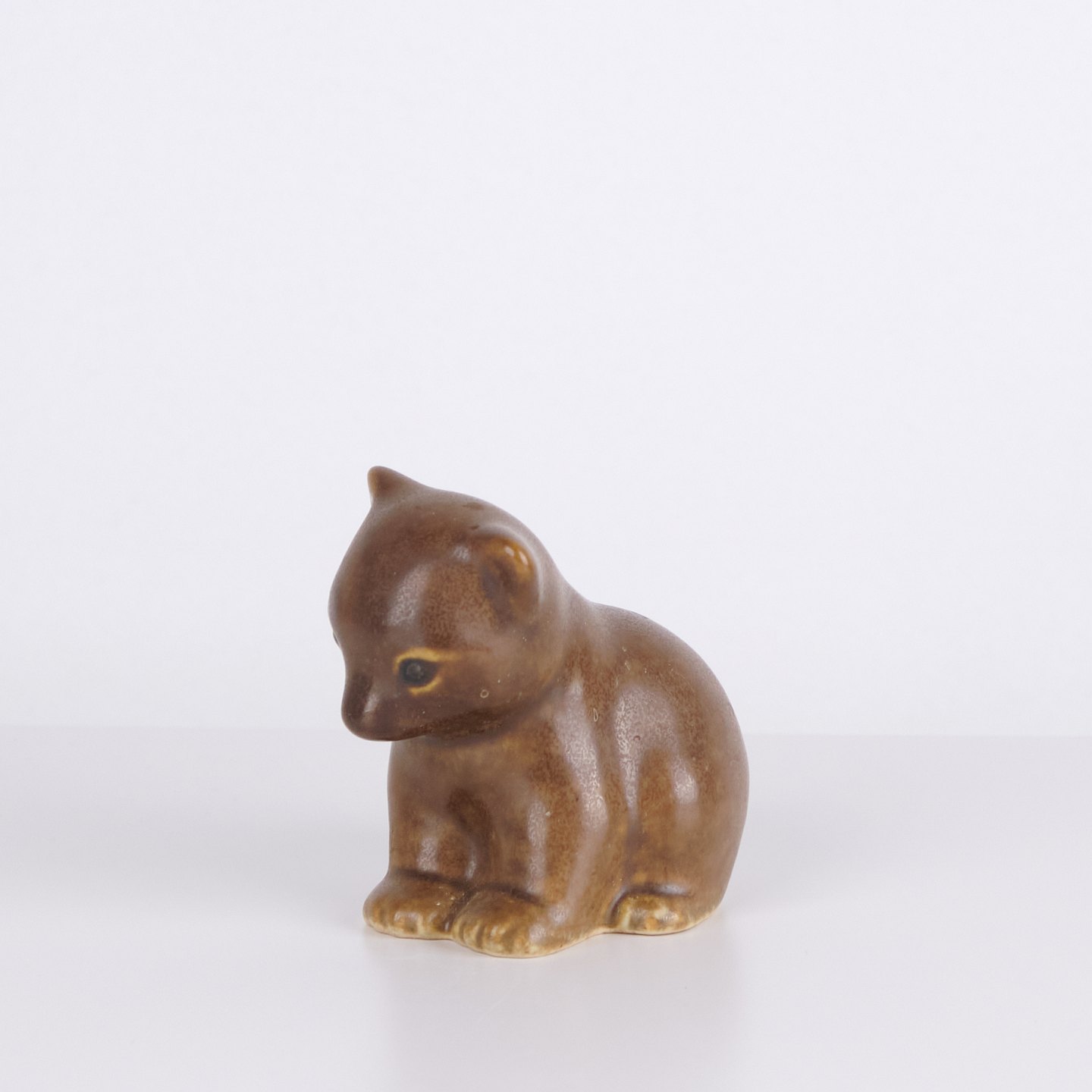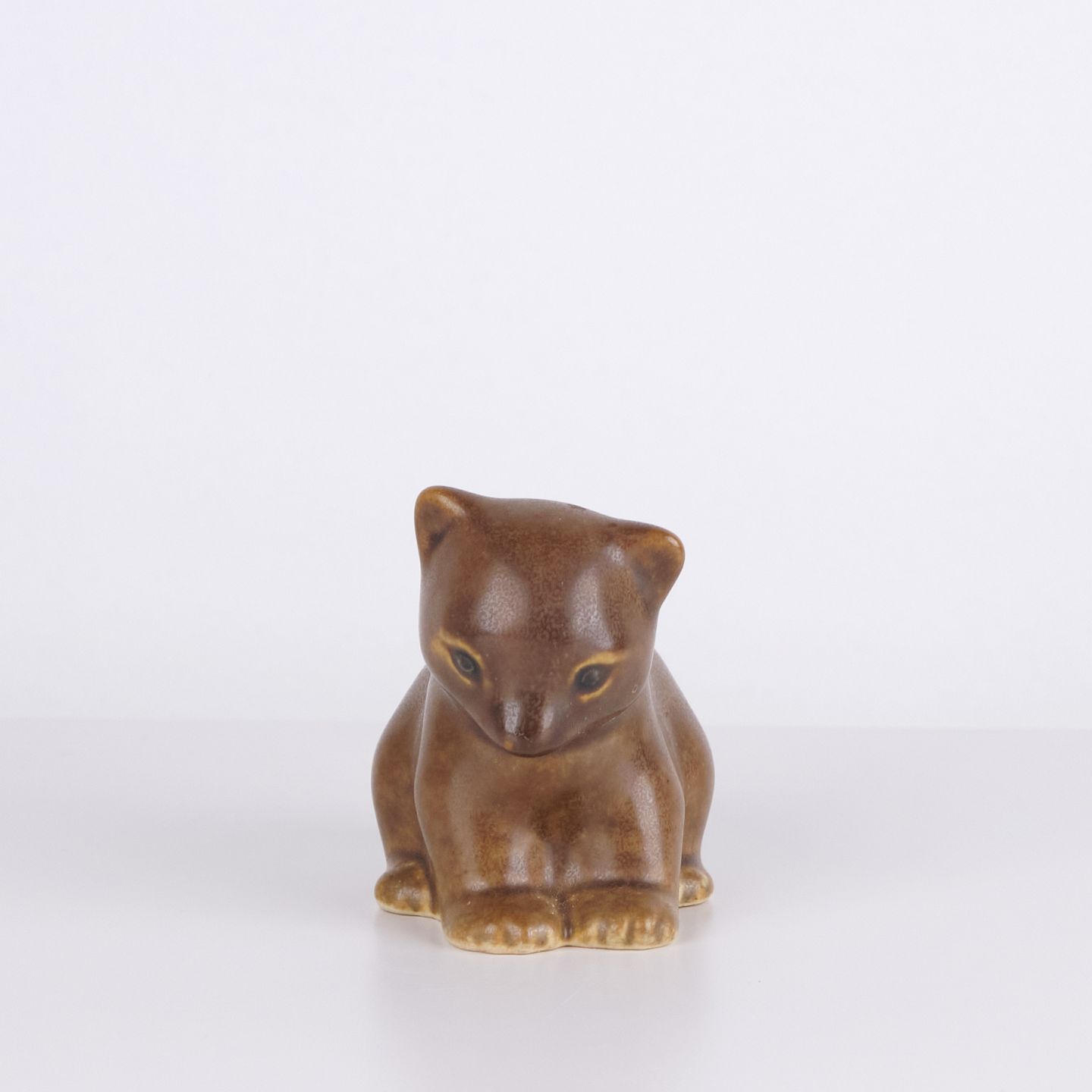 Bear figure by Knud Basse made in brown glazed ceramic. The figure shows a seated bear with lowered head, defined paws and soft forms. A smaller model from Knud Basse’s series of animal figures, produced in Denmark in the 1960s.