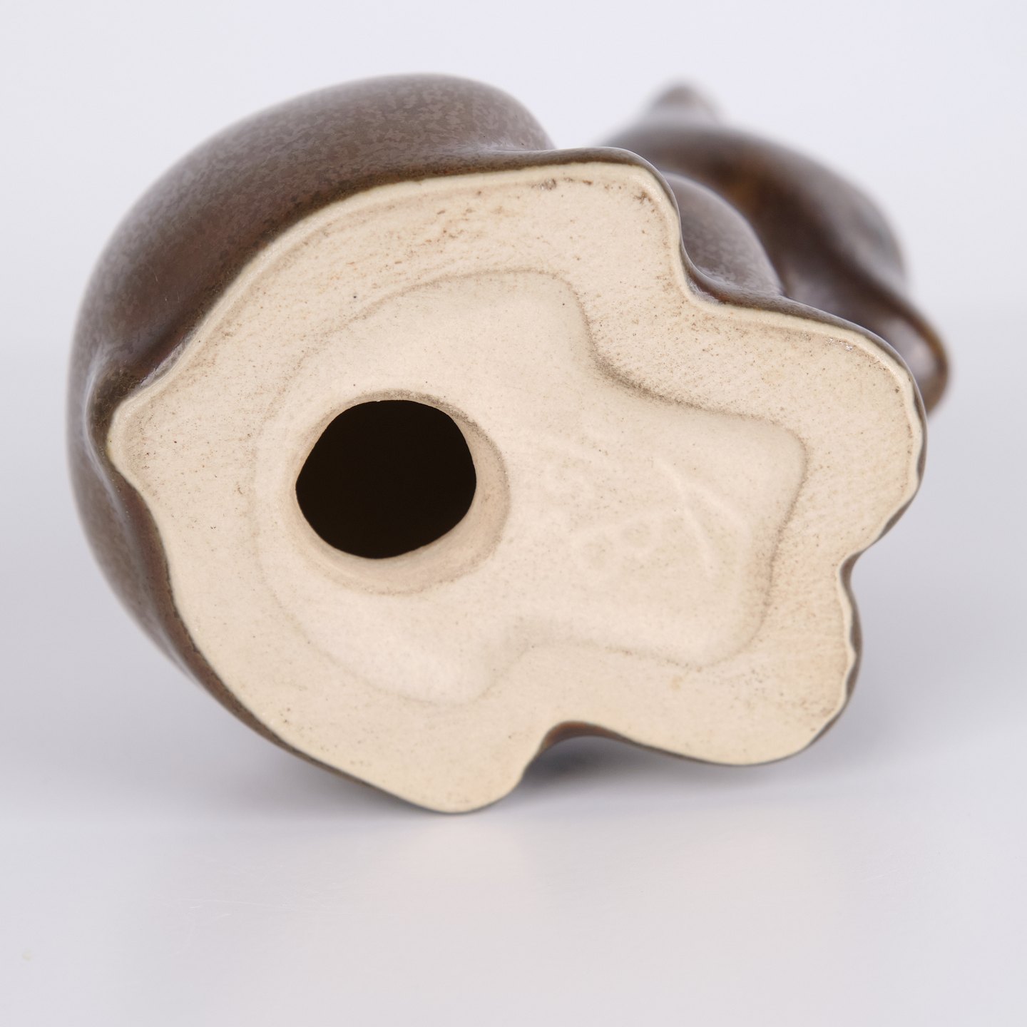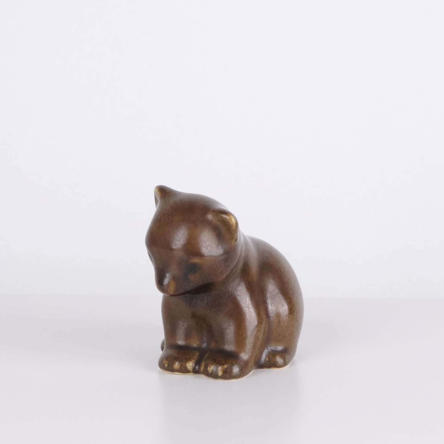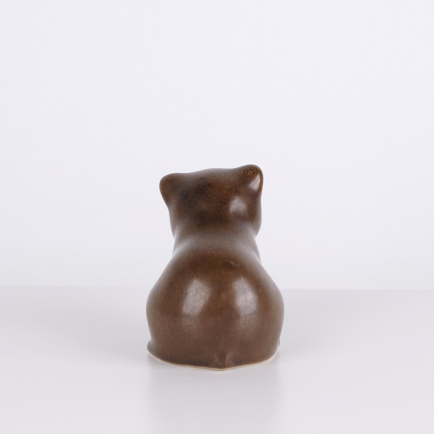 Bear figure by Knud Basse made in brown glazed ceramic. The figure is modeled in a seated form with slightly bent head and rounded lines, creating a calm and characteristic expression. A fine example of Knud Basse’s popular animal figures and Danish art pottery from the mid-century period.