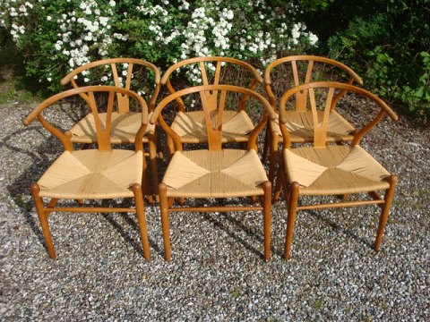 Six dining chairs designed by Niels O. Møller in the 1960s. Model 77 is made of teak with seats in green paper wicker. The chair's simple lines and curved backrest provide good seating comfort and a clear design language that has made Møller's design a permanent part of Danish furniture history. A solid choice for both classic and modern interiors.