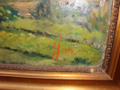 Painting with church tower in the background signed Ejner Johansen from 1919.