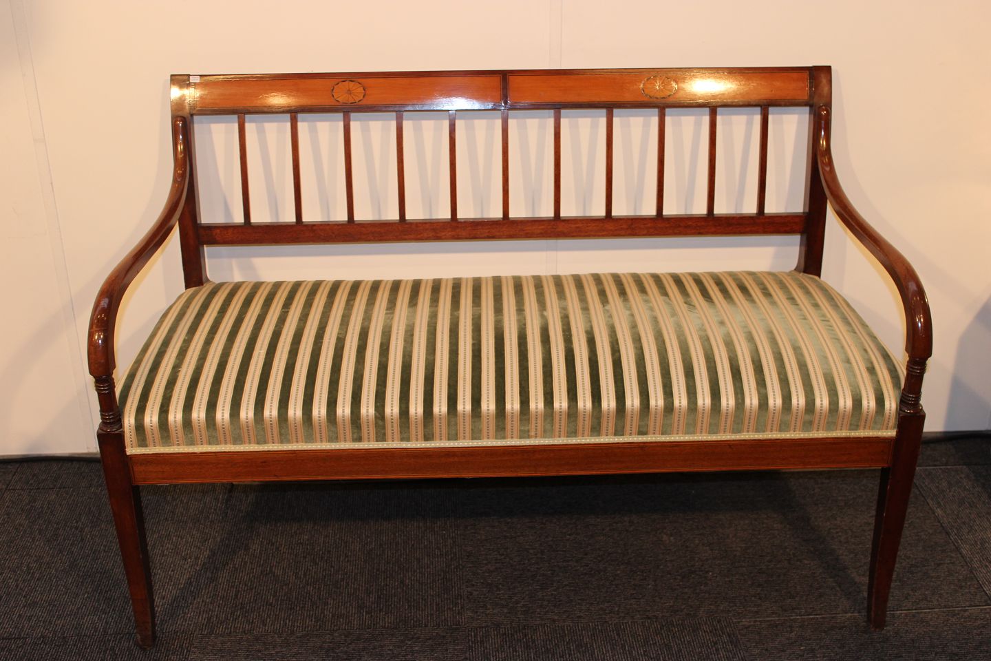 SoldEmpire salon sofa bench from around the late 1800 to the early 1900. Sofa Bench is in mahogany adorned with intarsia.It appears in perfect condition.