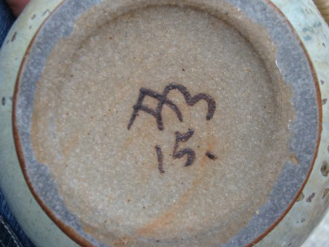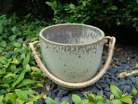 SolgtKrukke i sandfarvede nuancer med flettet håndtag designet og signeret af Arne Bang nr 15.