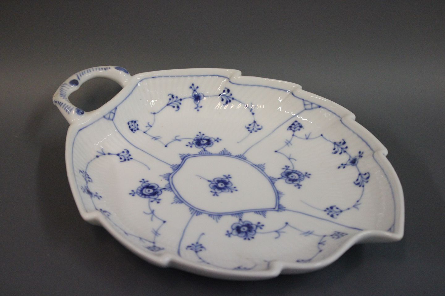 SoldRoyal Copenhagen leaf shaped blue fluted cake dish no. 1/145.