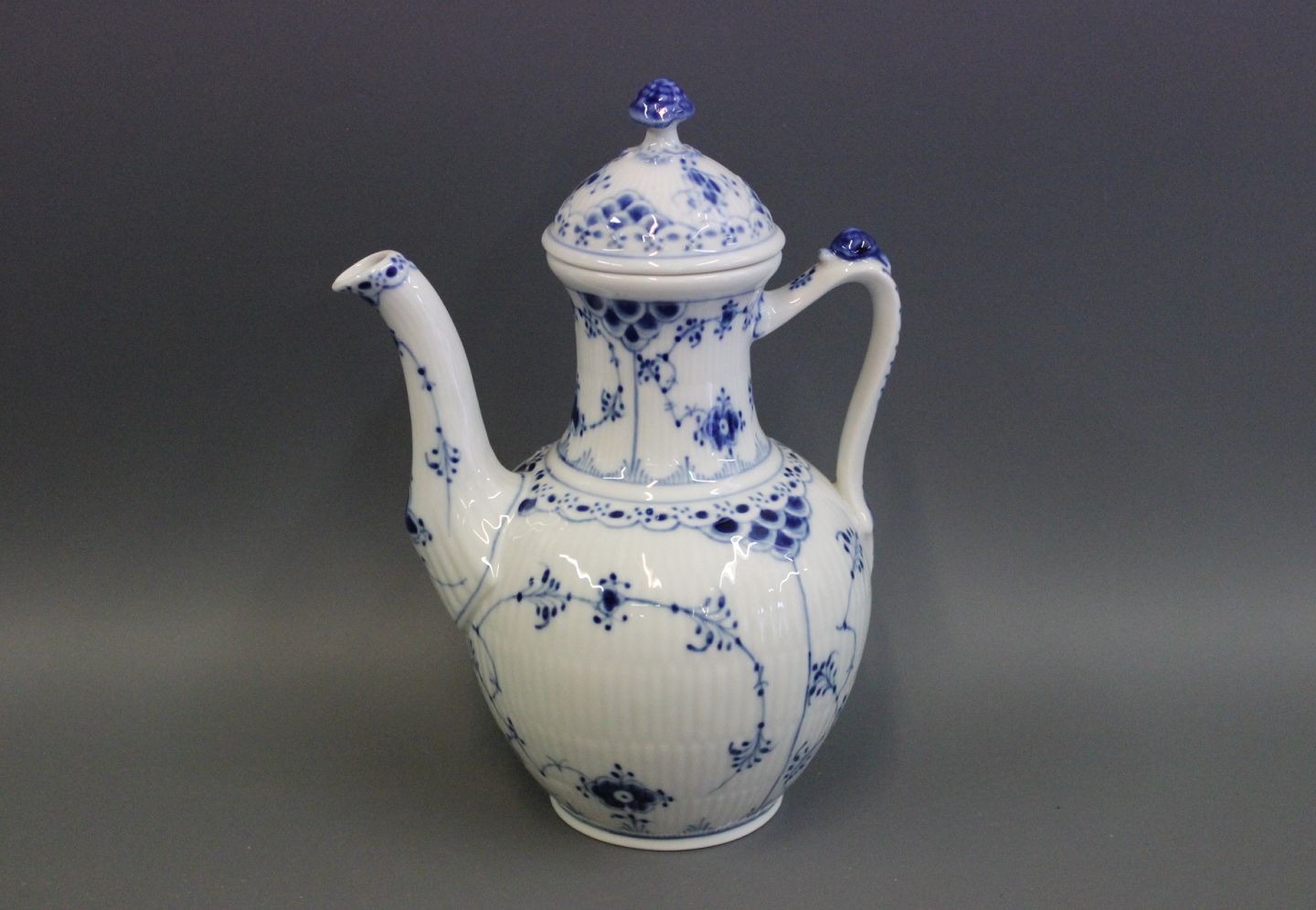SoldRoyal Copenhagen blue fluted half lace coffeepot/vase no. 518. The coffeepot was made in 1966 and designed in 1888 by Arnold Krog.