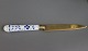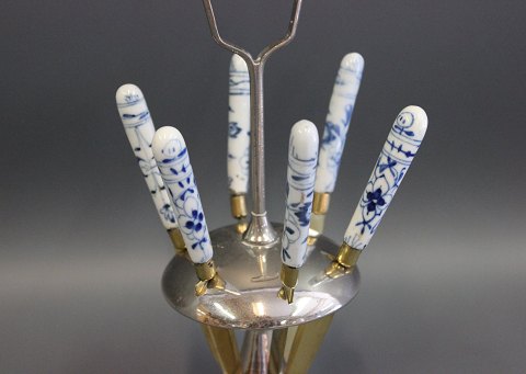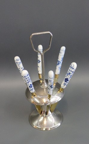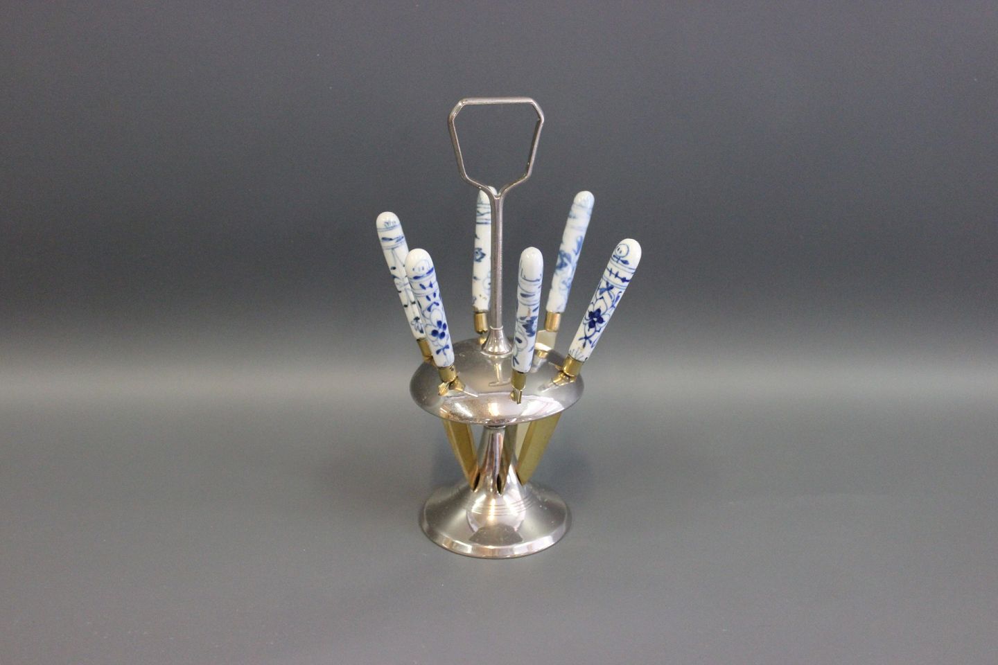 Silvered knife holder with 6 brass fruit knives in "the onion pattern".
