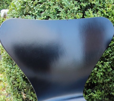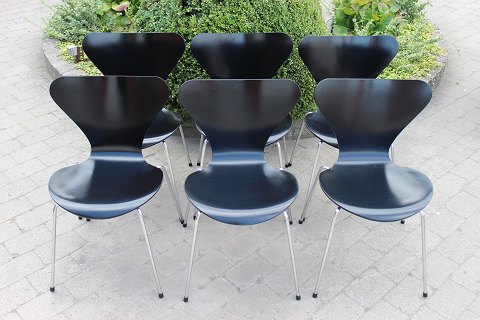 Sold6 Black seven chairs, model 3107, designed by Arne Jacobsen in the 1950s and manufactured by Fritz Hansen.