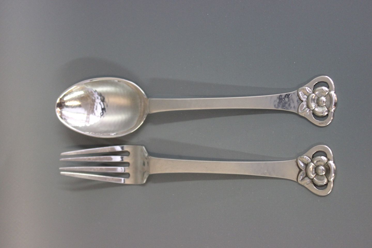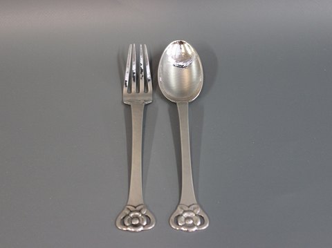 SoldEvald Nielsen child cutlery, spoon and fork, no. 9, in 830 silver, from 1924. The cutlery has been polished up.