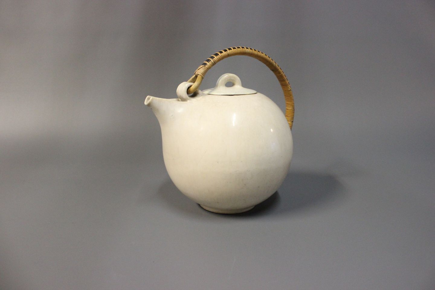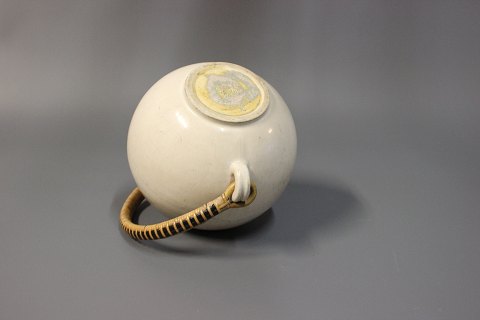 SoldWhite glazed stoneware teapot with bast handle from around the 1940s. The teapot is stamped Saxbo Denmark and with the no. 68, designed by Eva Stæhr Nielsen.