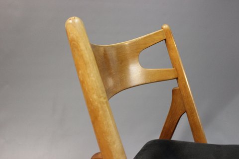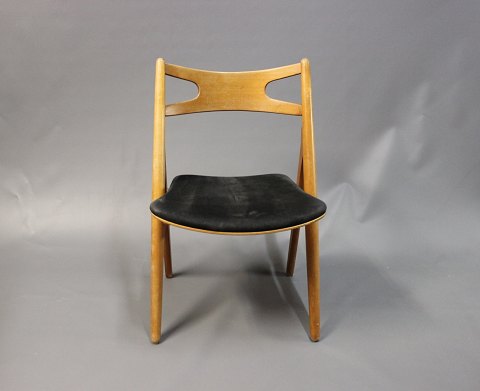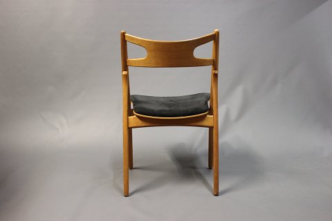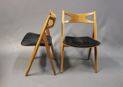 SoldA pair of "Sawbench" dining room chairs in polished beech and suede, model CH29. The chairs were designed by Hans J. Wegner in 1952 and manufactured by Carl Hansen & Son.