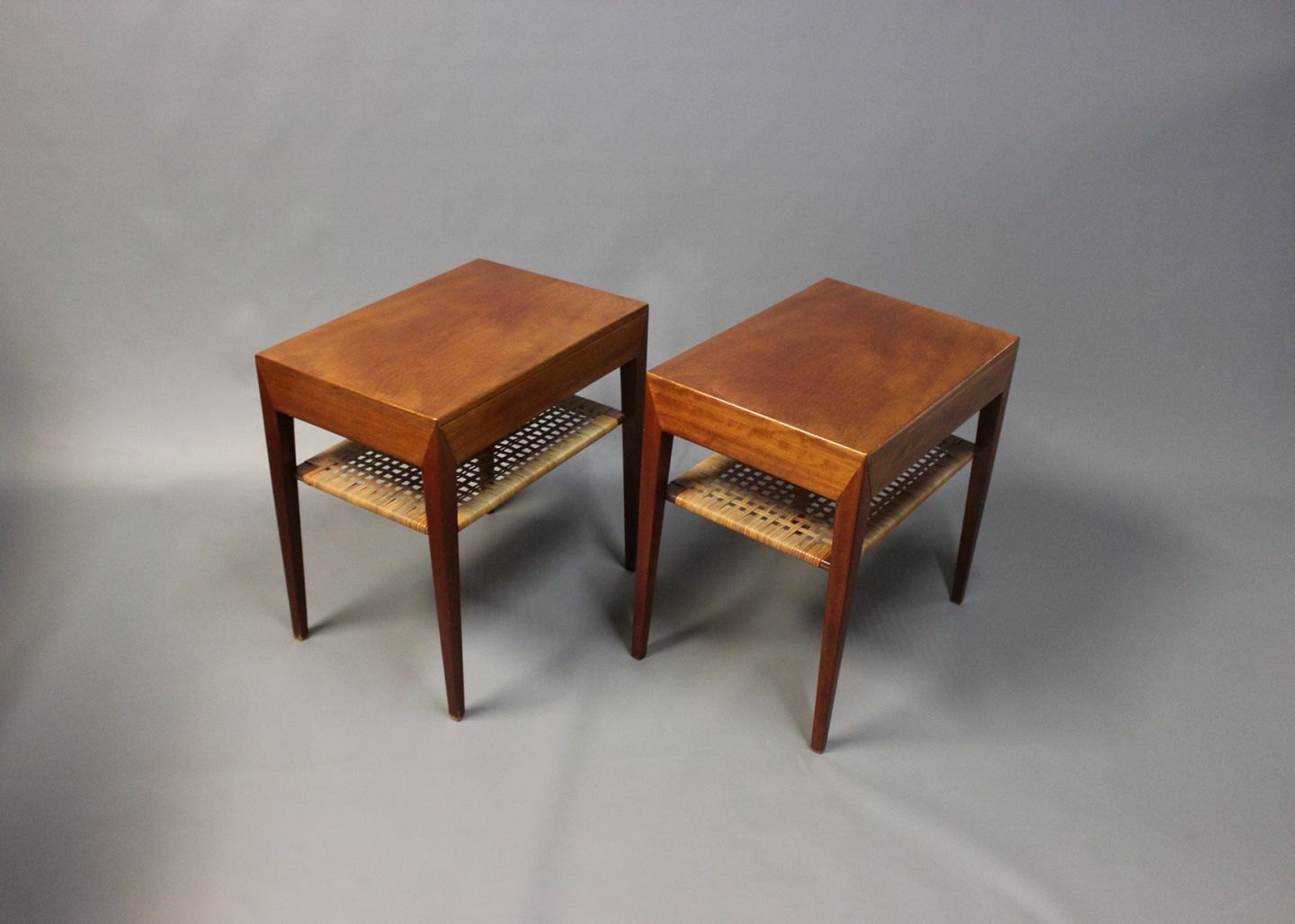 A pair of sidetables designed by Severin Hansen for Haslev Furniture Factory in the 1960s. The tables are in mahogany and cane beneath.