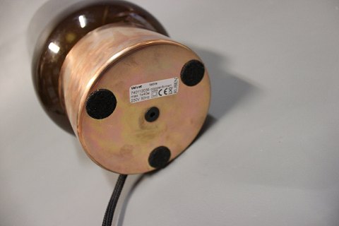 SoldRuben, Velvet, tablelamp designed by Niclas Hoflin in copper and Brown glass. The lamp is an exhibition model and has therefor never been used.