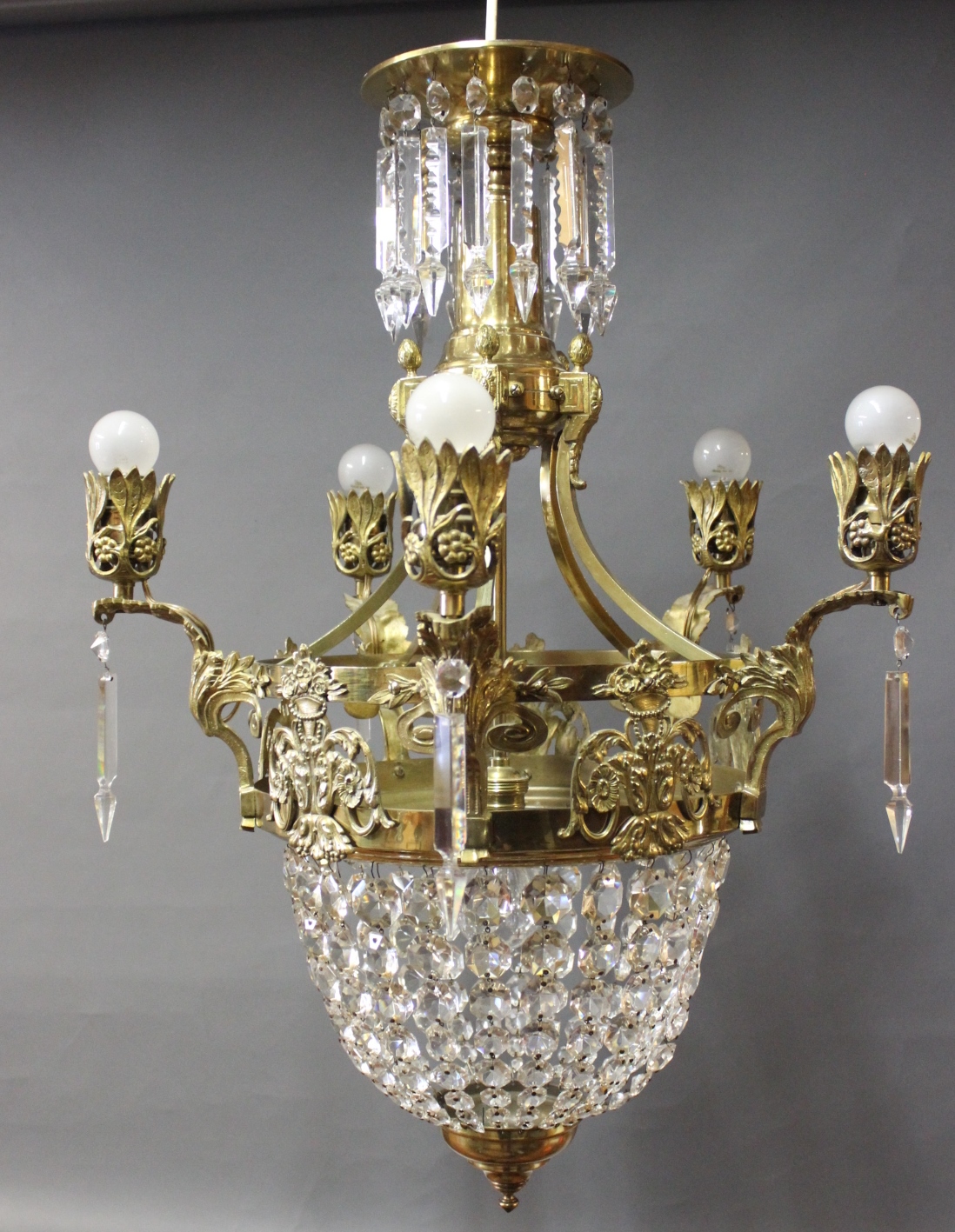 SoldCrystal Chandelier, Five-armed with patinated brass .from around 1910