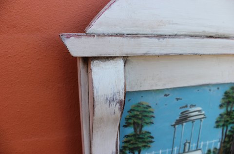 SolgtLille gråmalet spejl i gustaviansk stil fra 1810. Spejlet er udsmykket med et lille maleri i toppen.