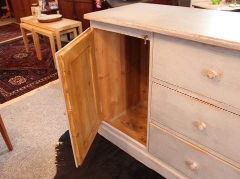 SoldGrocer's disk in grey painted pine Wood from the 1930s. The disk is in good condition and with fillings in the back.