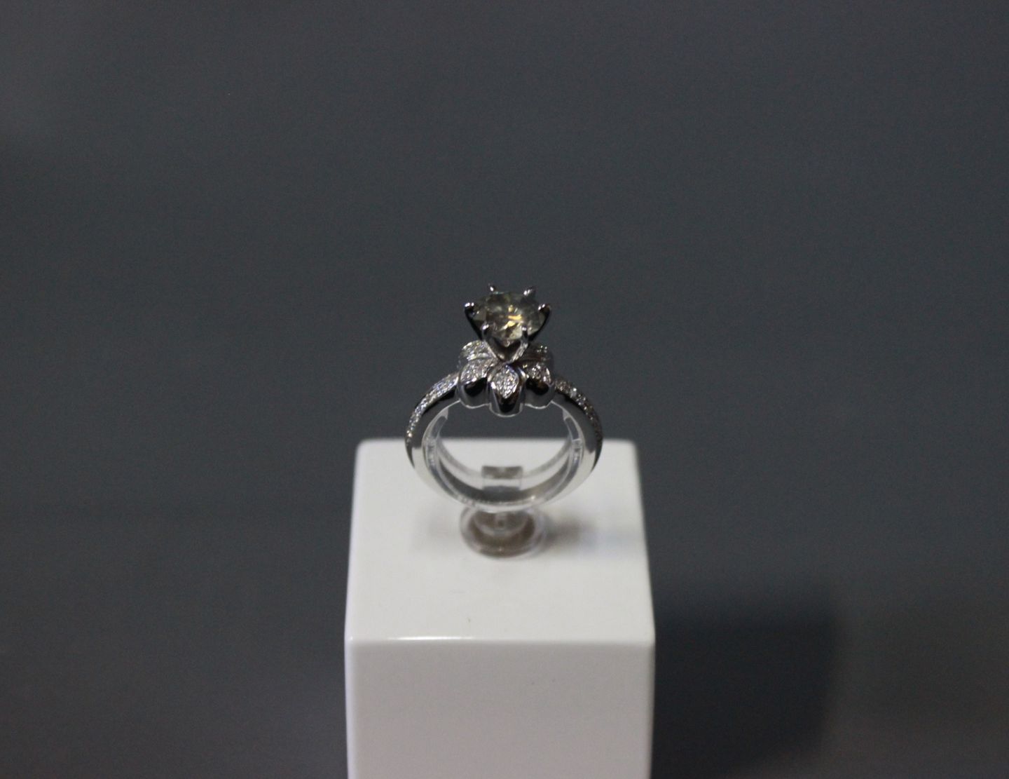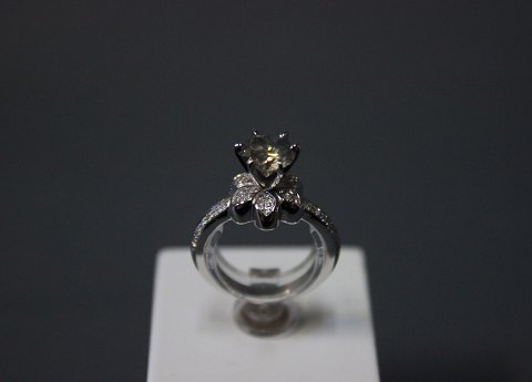 Ring in 14 ct. whitegold with large diamond, 1,8 ct., clarity P1, color grey/Brown along with smaller 0,4 ct. diamonds.