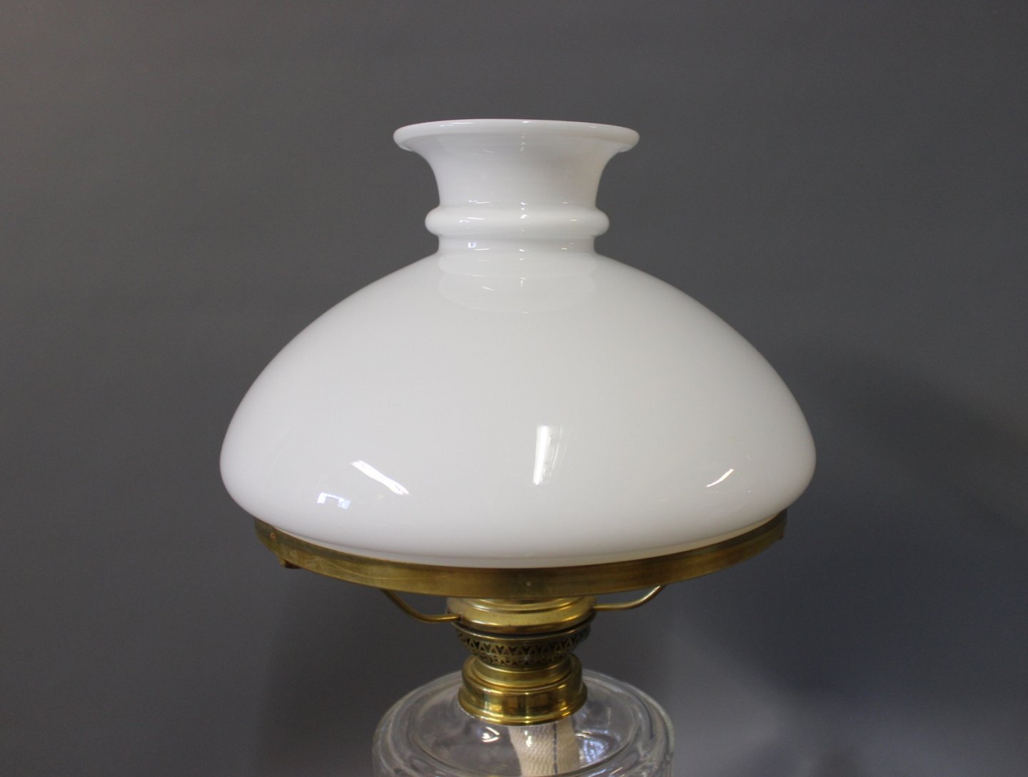 Kerosene table lamp with orange glass stem and brass foot from around the year 1880.