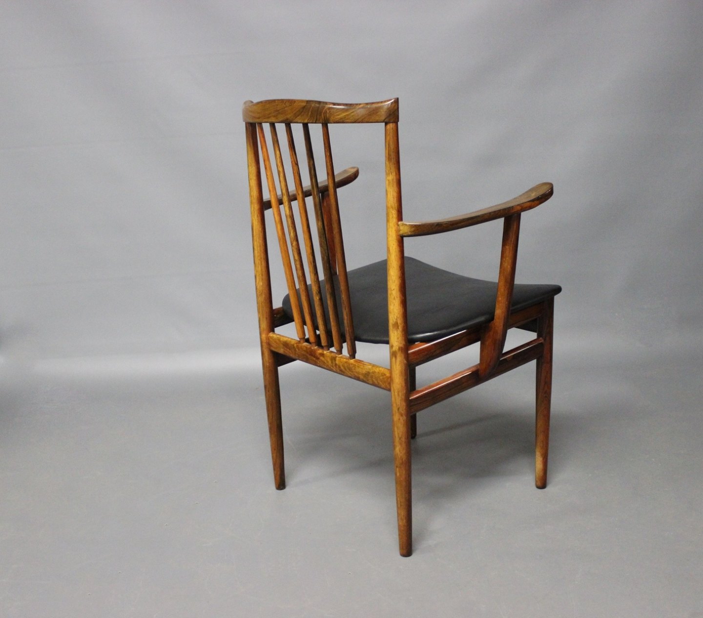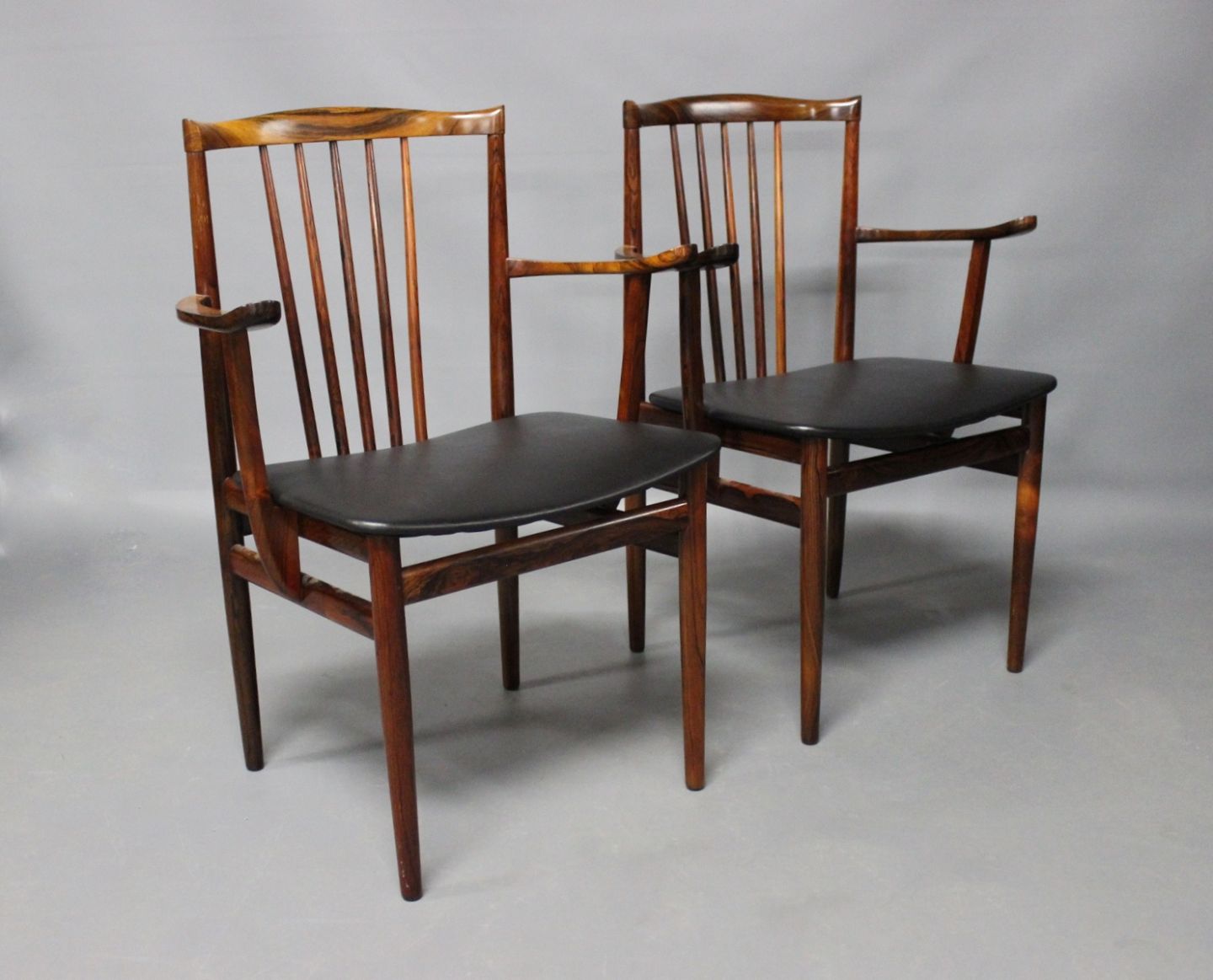 SoldA pair of armchairs in rosewood and seat of Classic Black leather designed by Henning Sørensen in 1968.