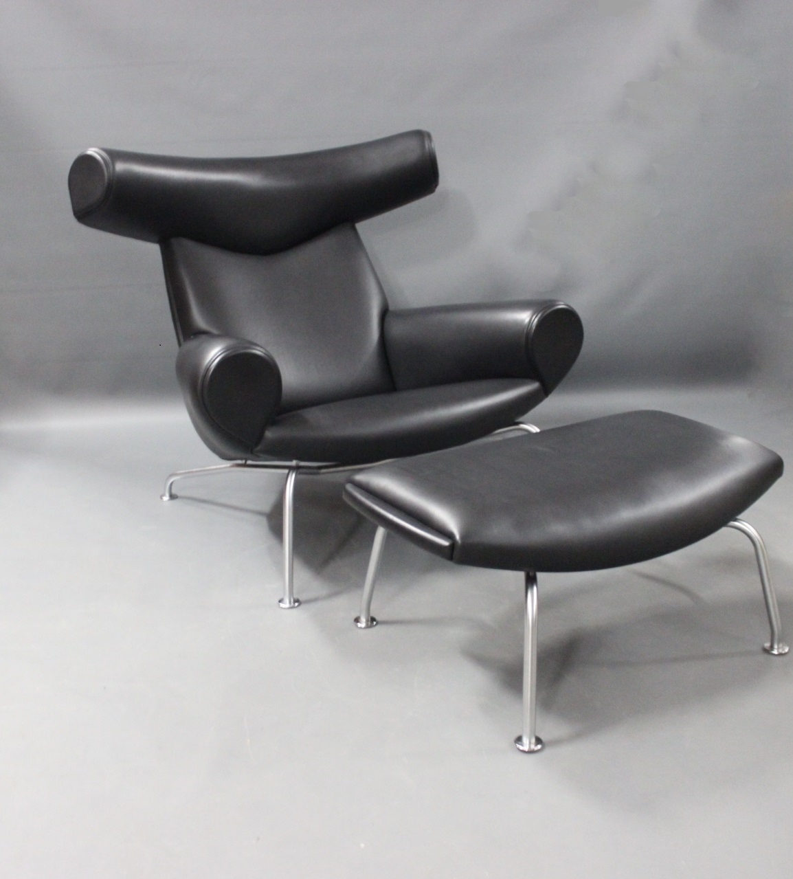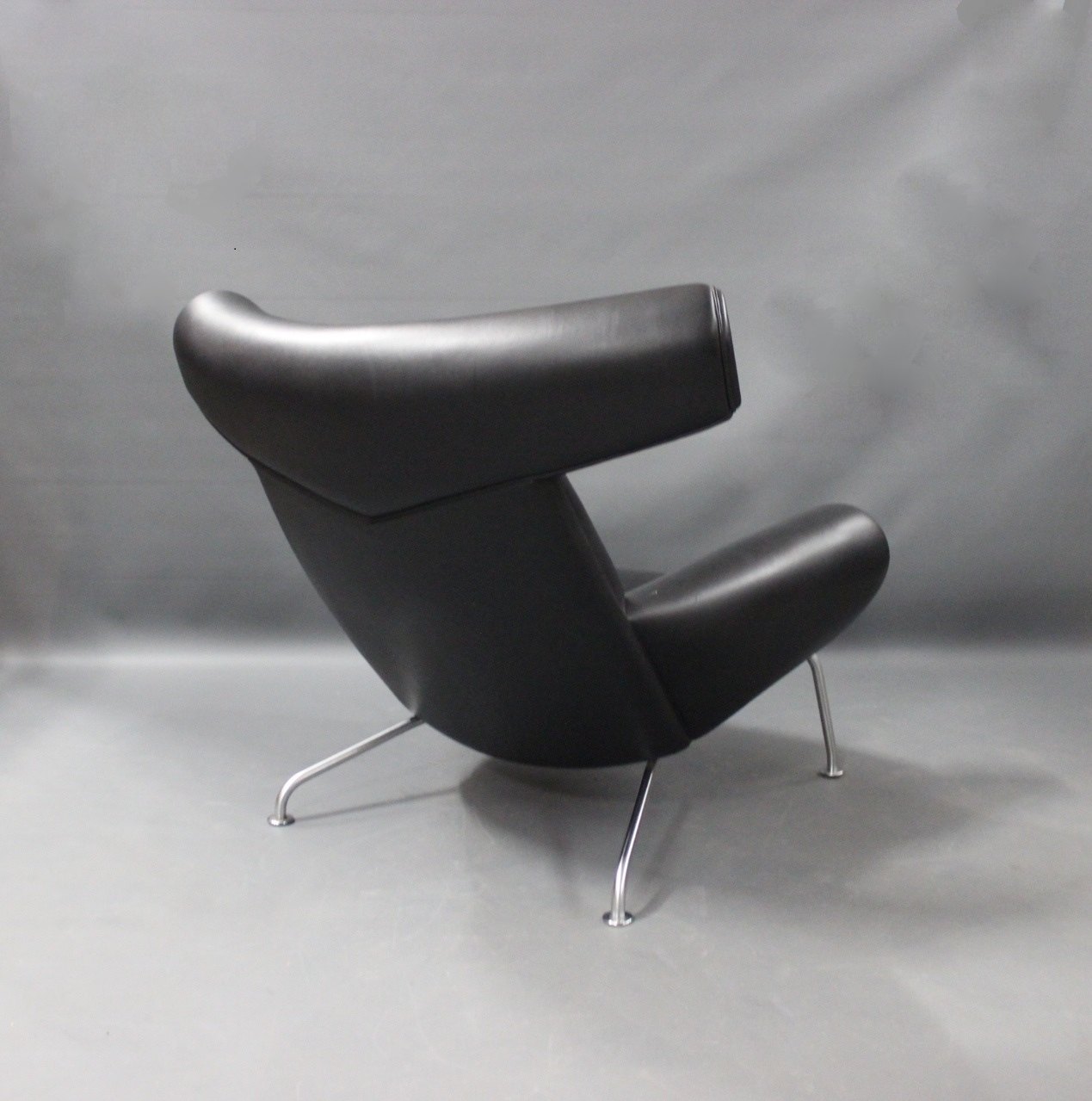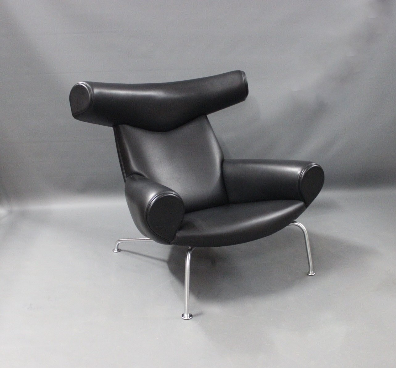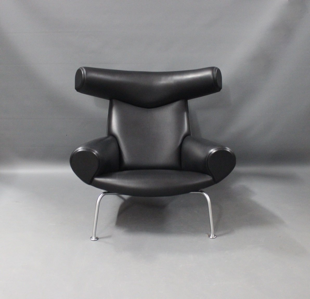 The Ox Chair, model EJ 100 and stool model EJ 100-F, upholstered in Black leather, designed by Hans J. Wegner in the 1960s and manufactured at Erik Jørgensen furniture factory the 20th of January 2008.