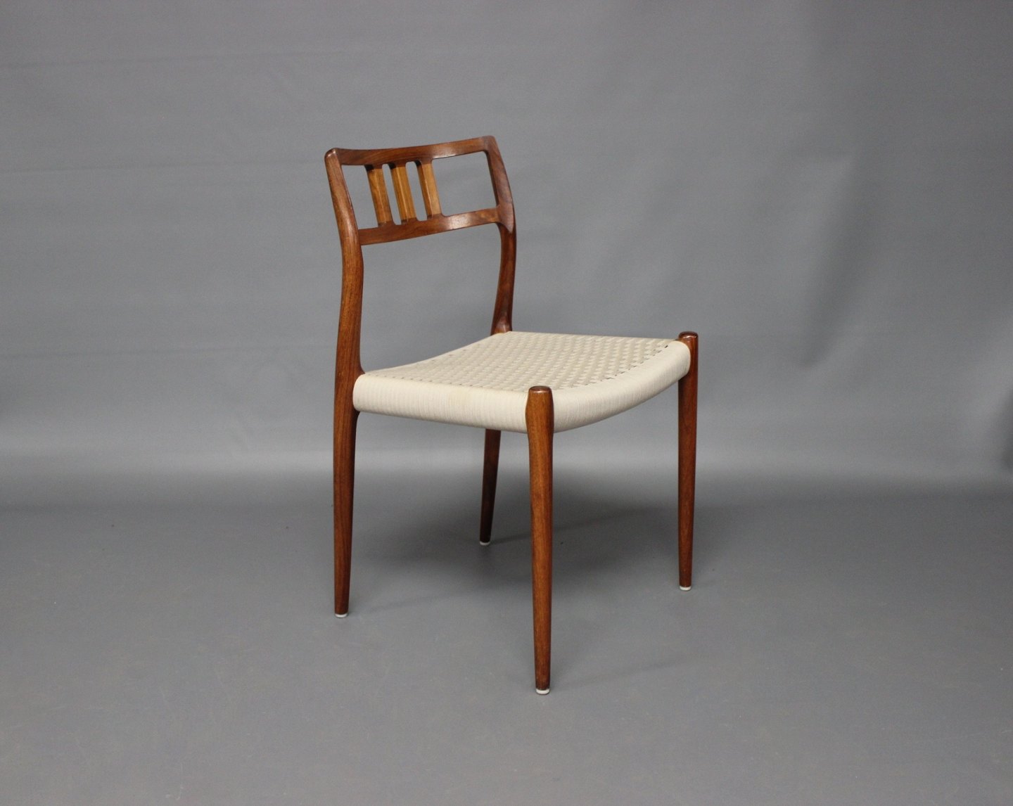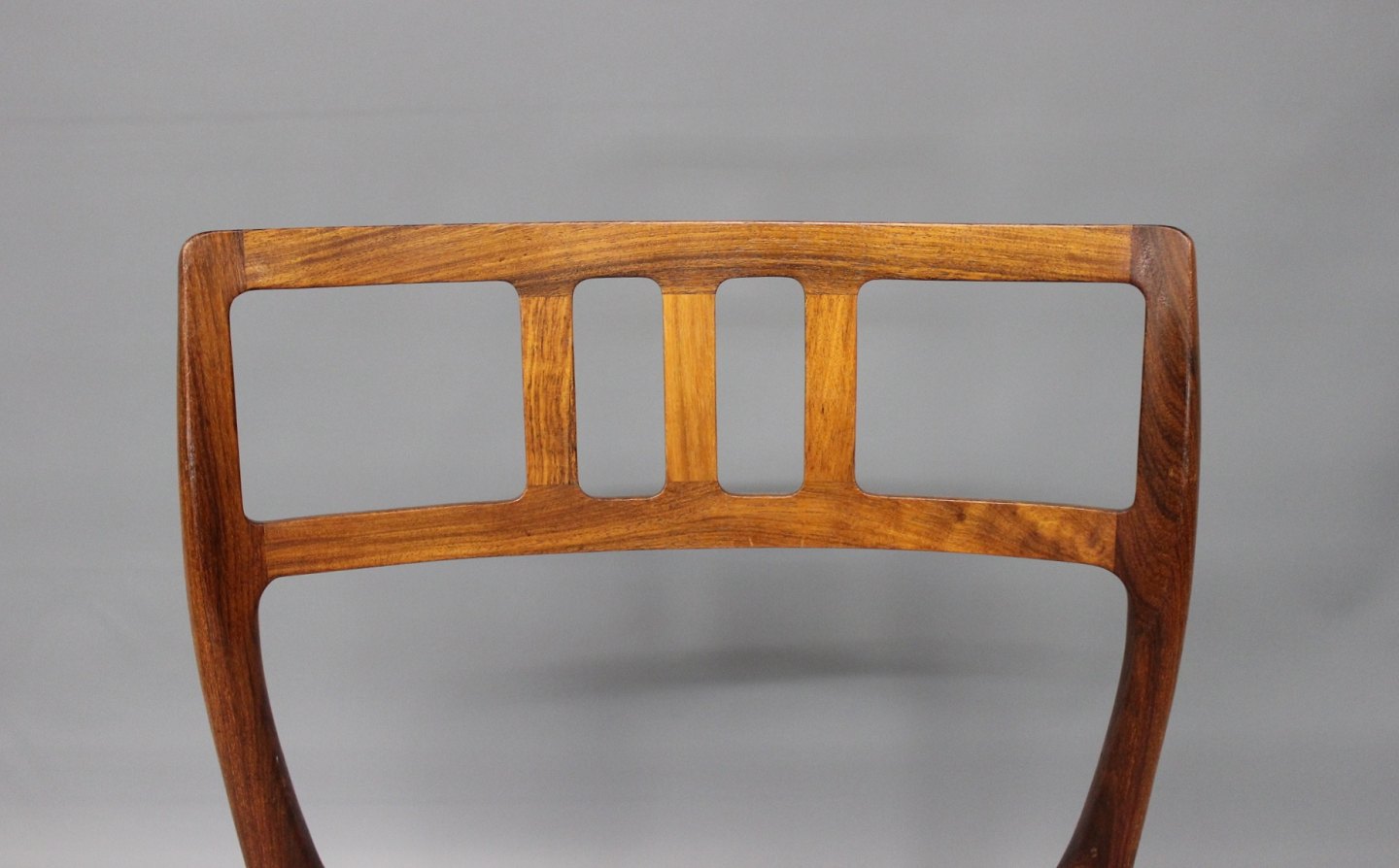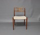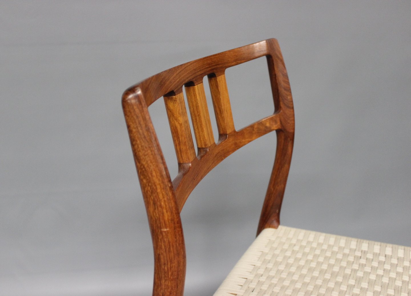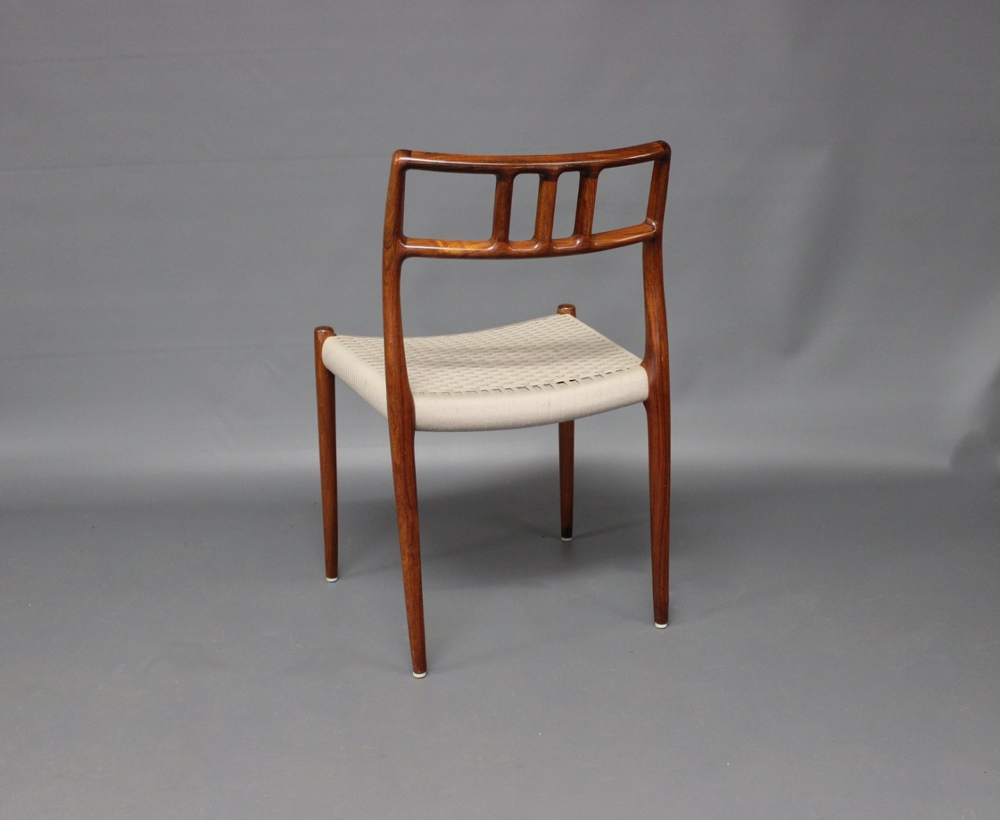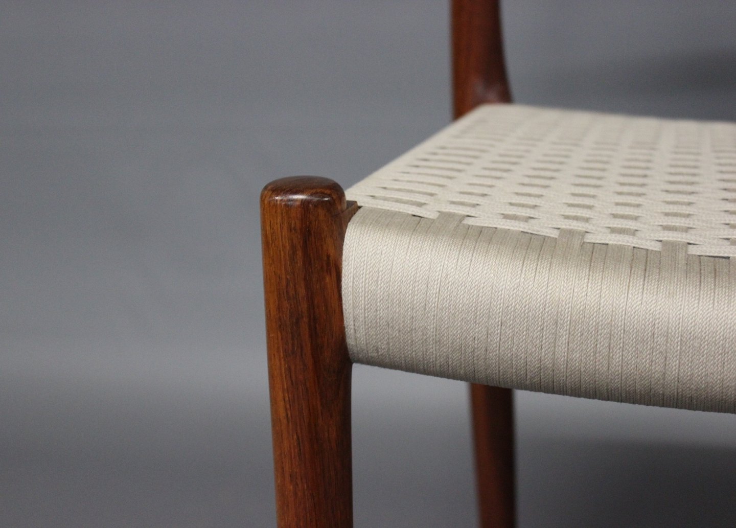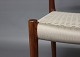 A set of six dining room chairs, model 79, designed by N.O. Moeller in 1966 and manufactured by J.L. Moeller in the late 1960s. The chairs are made of rosewood and light grey seats.