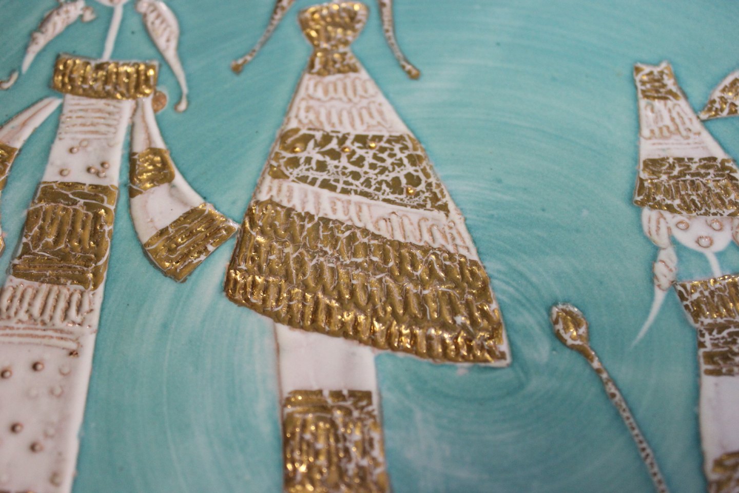 Large italian ceramic dish in turquoise glaze decorated with figures in gold.