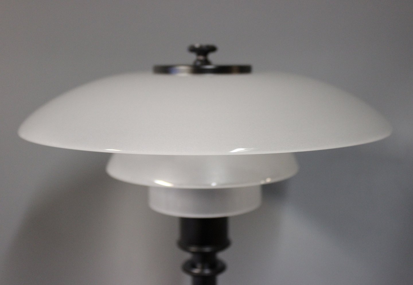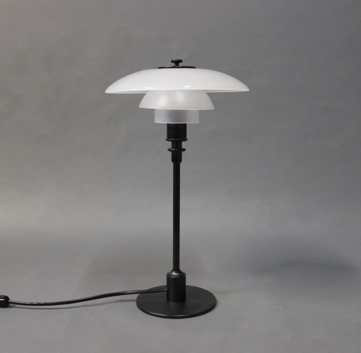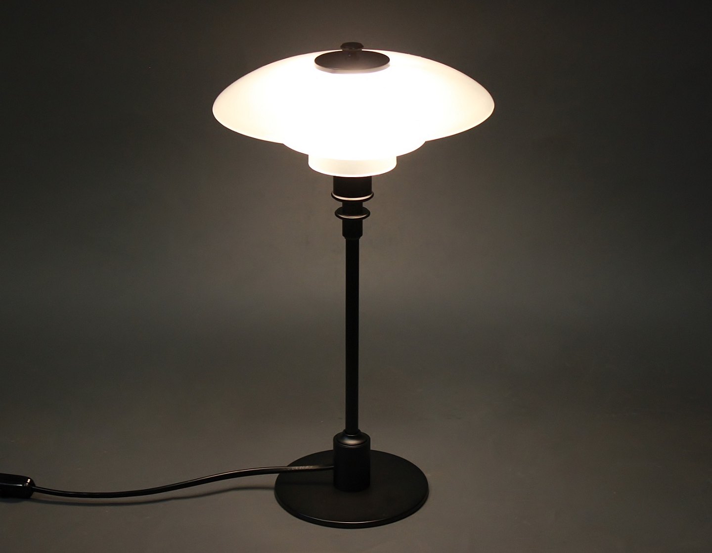 PH 2/1 tablelamp, anniversary model, designed by Poul Henningsen and manufactured by Louis Poulsen. The lamp is with shades of matt opaline glass and black lacquered frame.