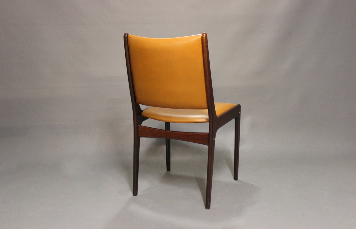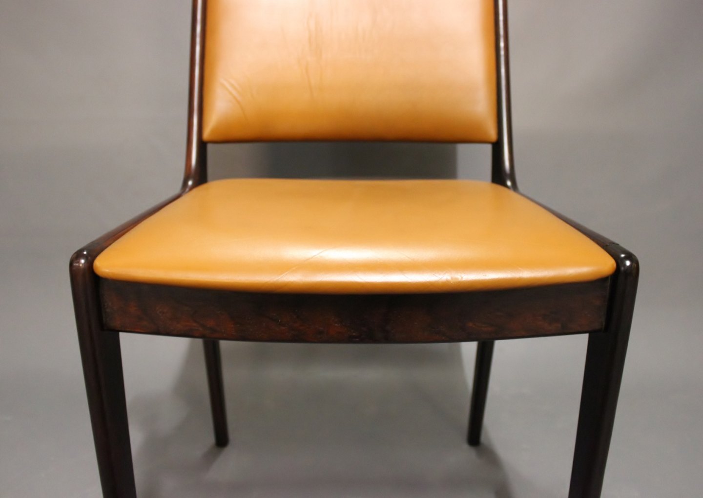 SoldA set of 4 dining room chairs in polished mahogany and cognac colored leather. The chairs are of danish design from the 1960s.