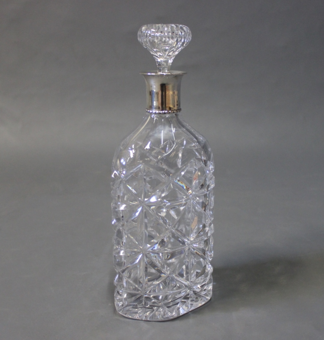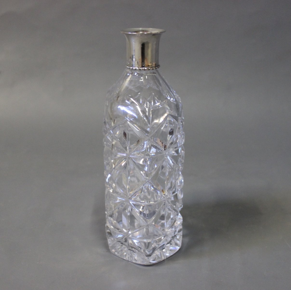 Decanter of crystal with edge of hallmarked silver from the 1930s.
