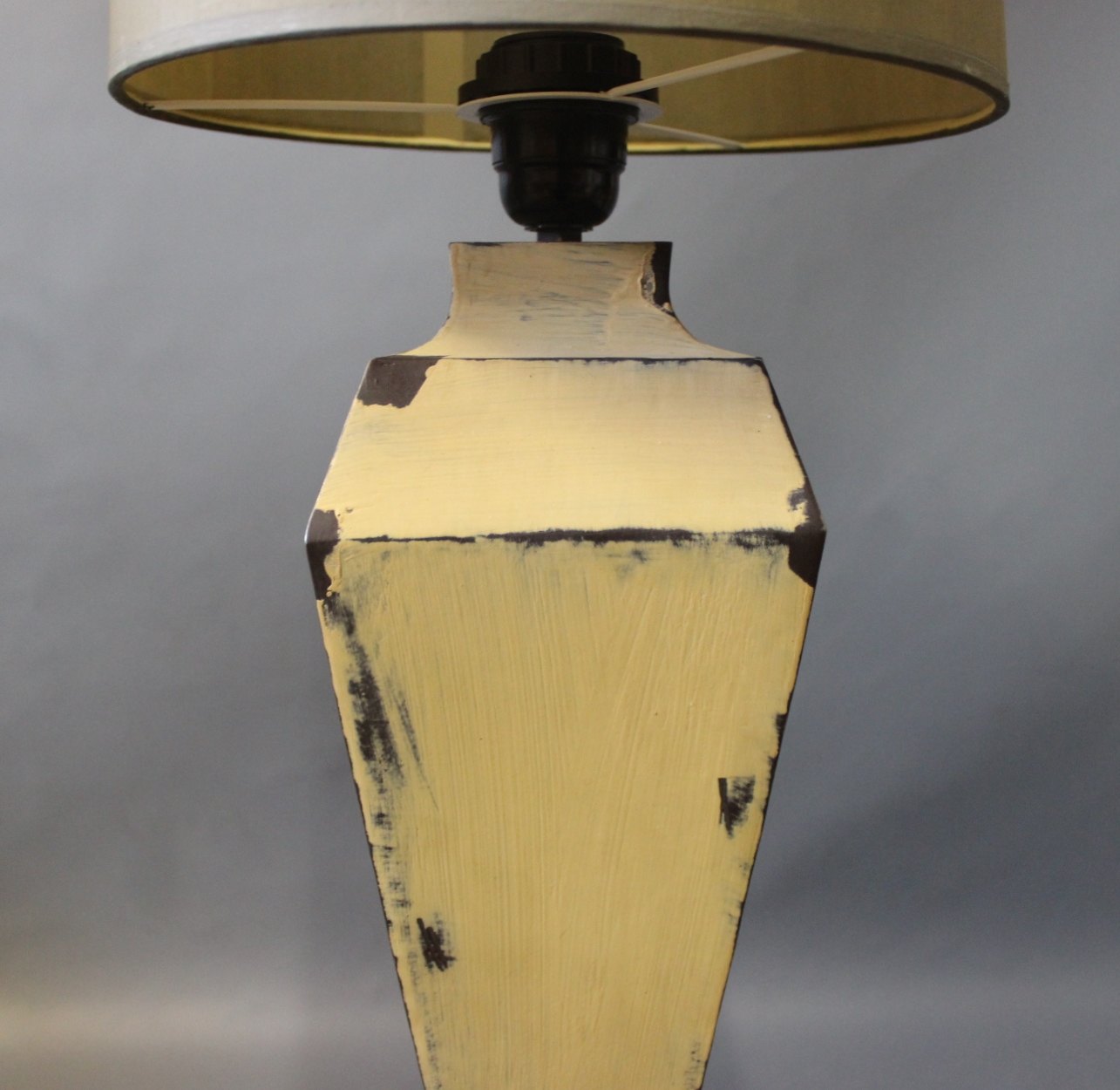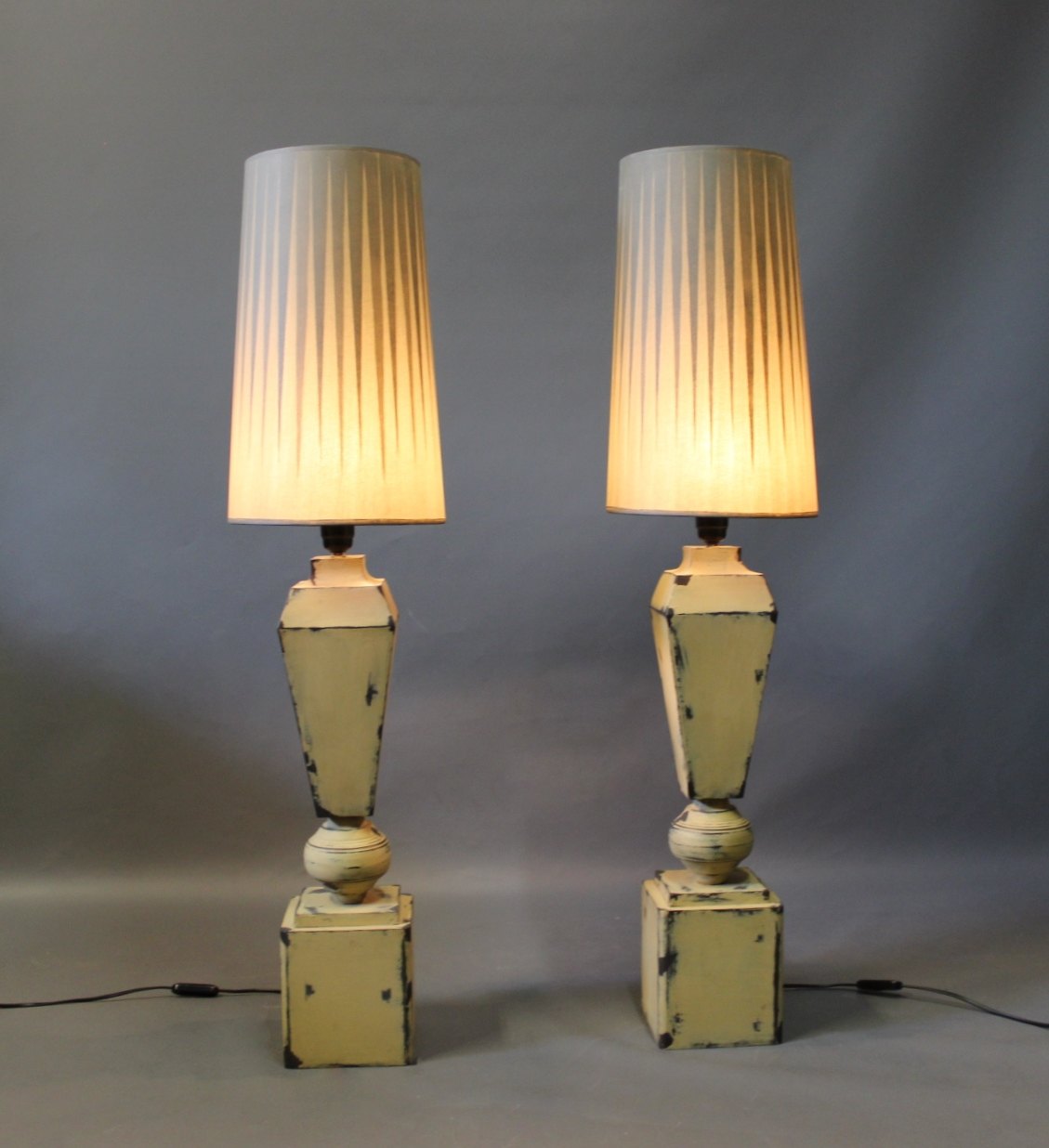 Høje bordlamper af bemalet metal samt grå skærme. Lamperne er fra omkring 1960erne.