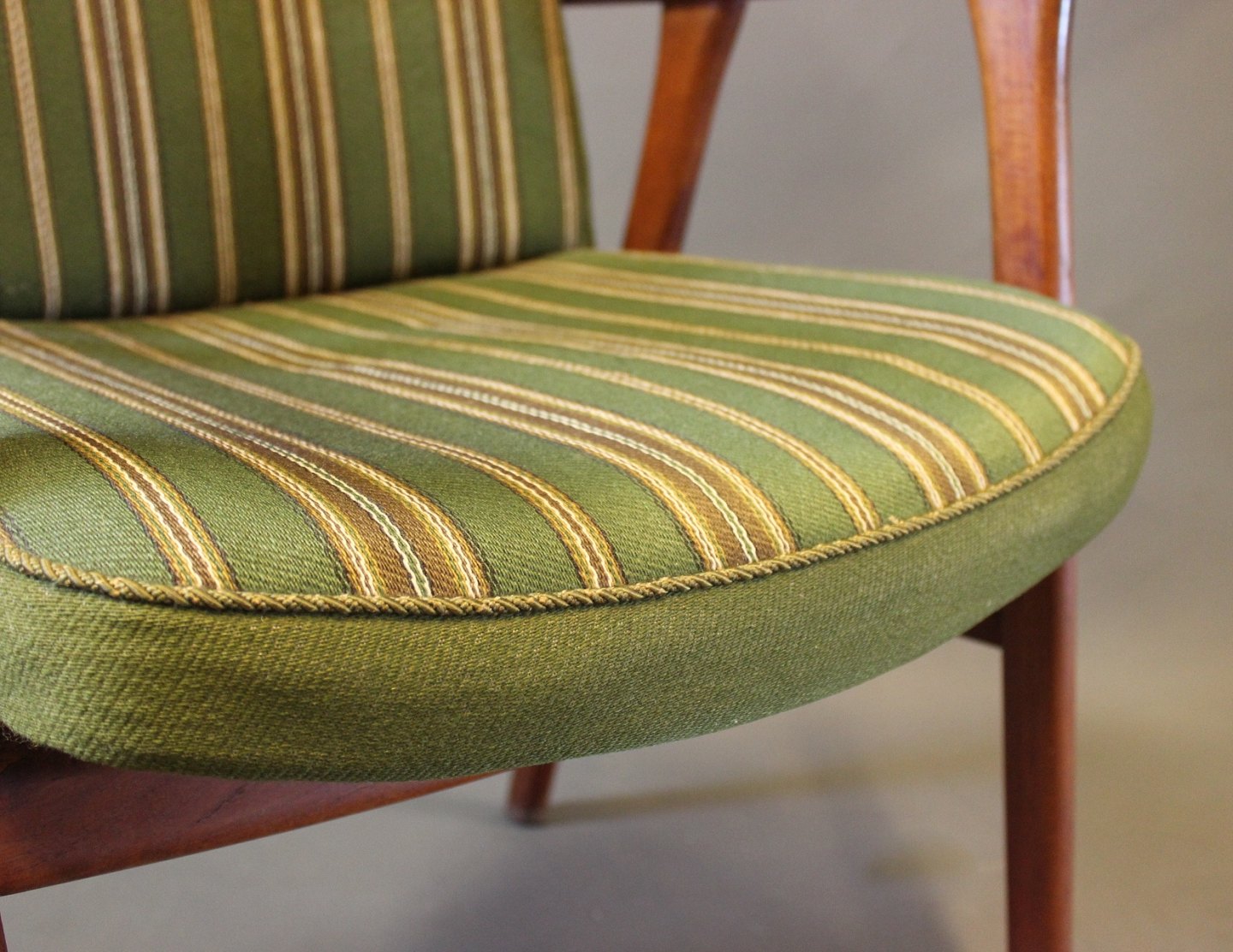 Armstol i teak og polstret i grønt stof af Dansk design fra 1960erne.
