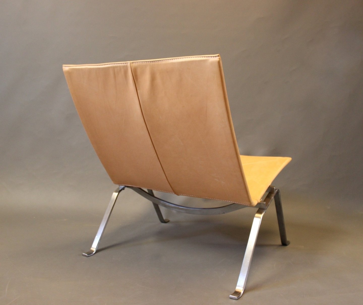 SolgtEn PK22 lænestol designet af Poul Kjærholm i 1955 og fremstillet i 1970erne. Stolen er med lyst vegetal læder og stel af krom.