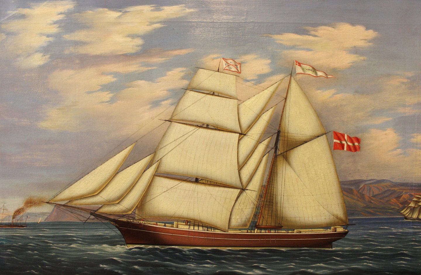 Oilpainting with motif of the danish ship "Vedele" from Vejle 1867 painted by the ship's Captain and with silver painted frame.