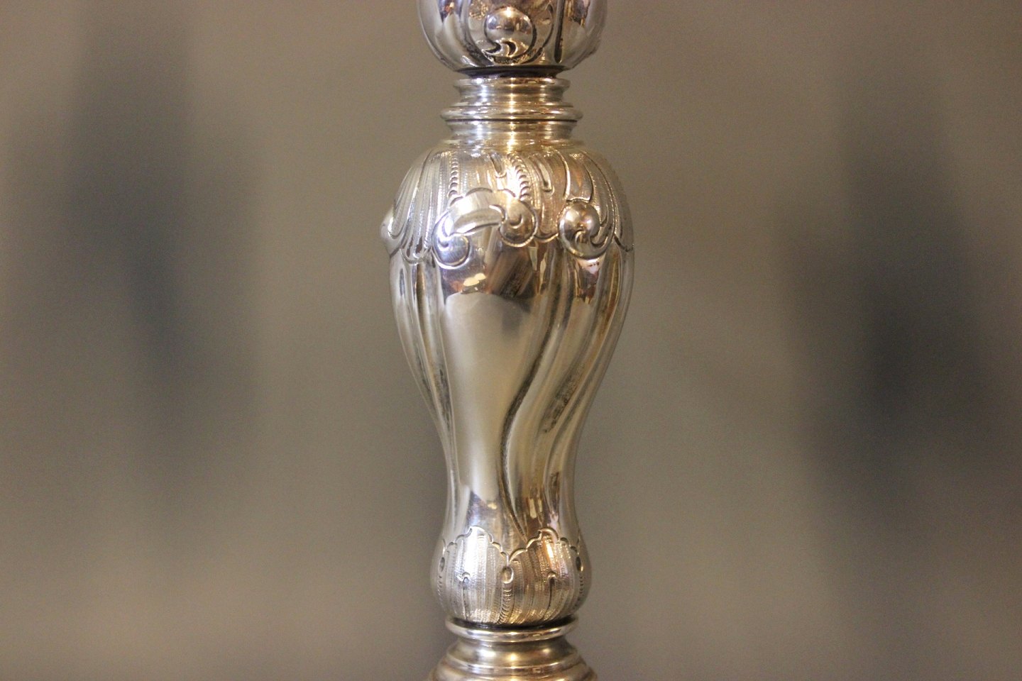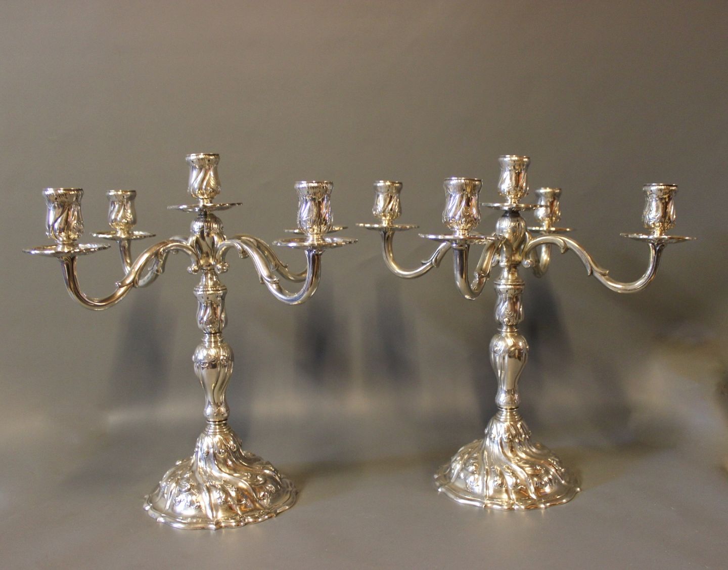 SoldA pair of five armed candlabras in 925 sterling silver by English Silver House and stamped AxS. They are newly polished and in great condition.