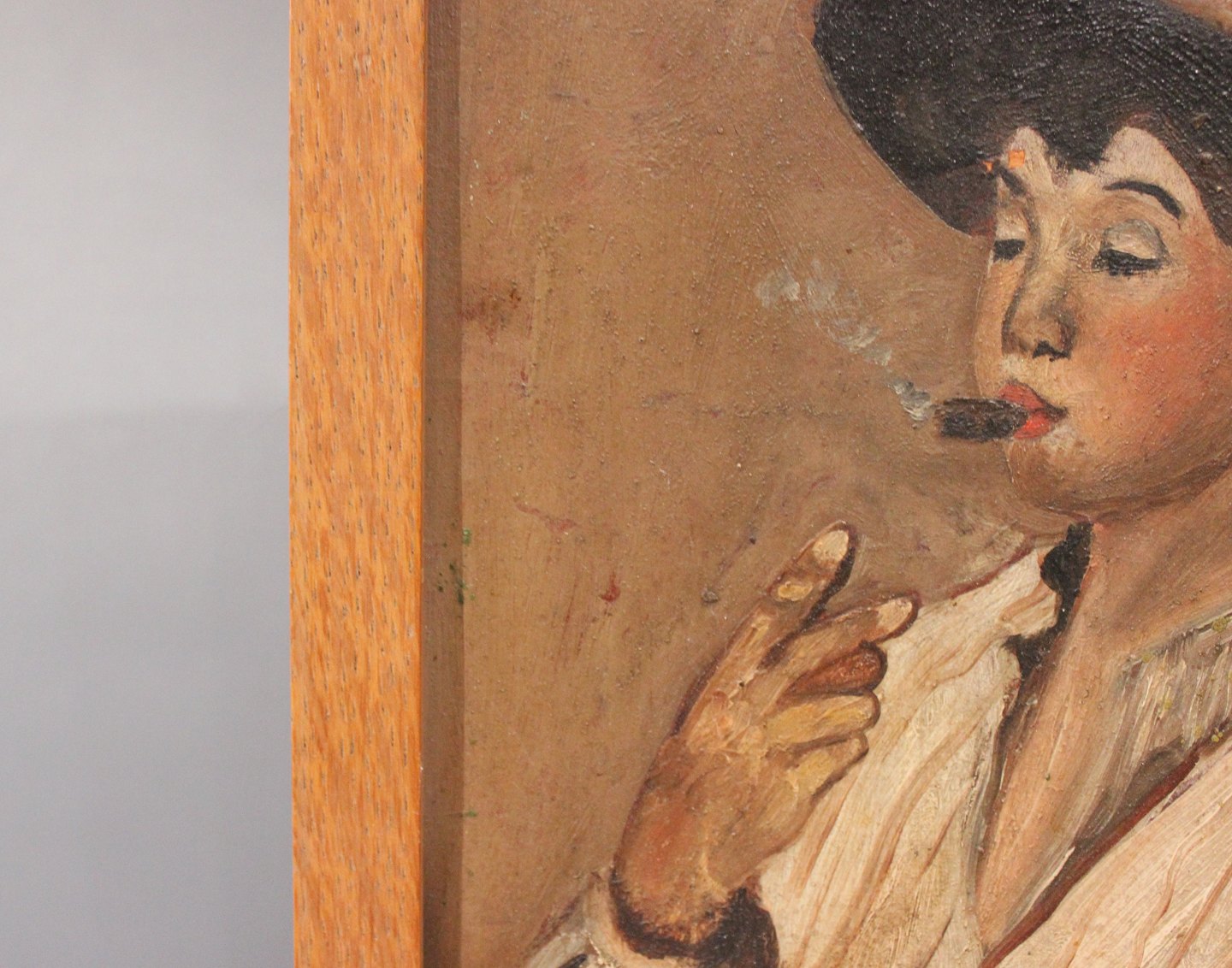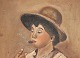 SoldSmall painting in brown colors with motif of a boy and simple wooden frame.