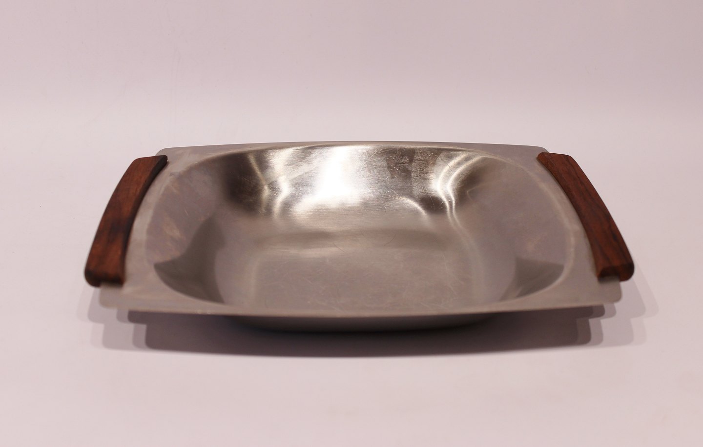 Serving dish in stainless steel with teak handles of danish design from the 1960s.