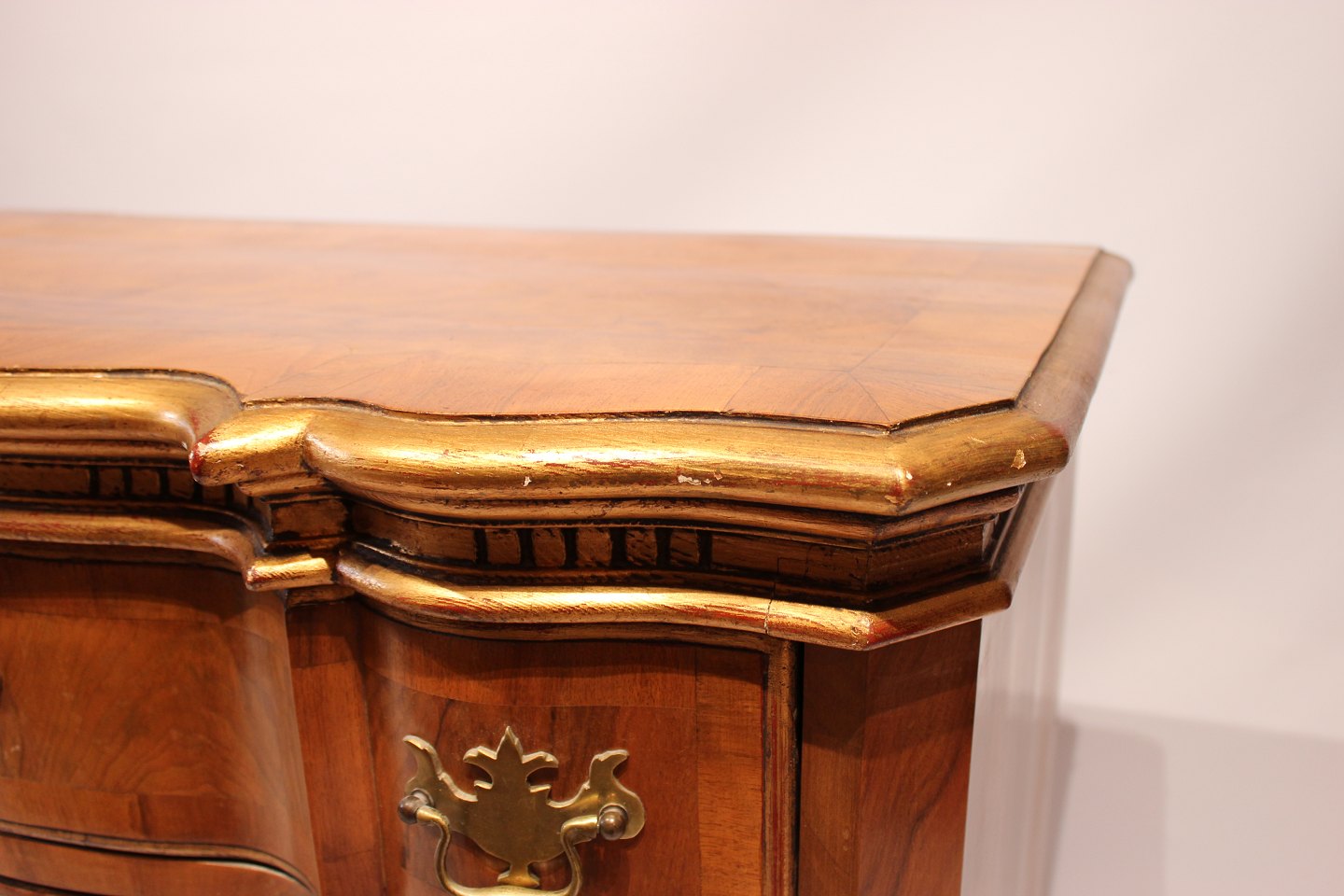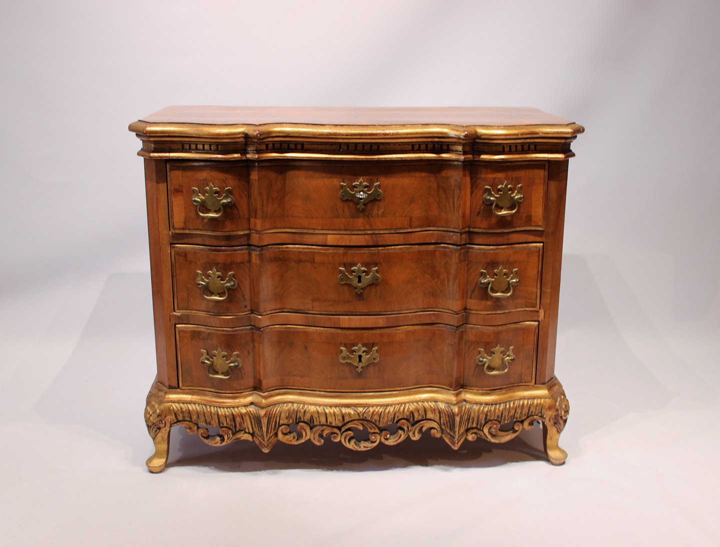 SoldRococo chest of drawers in walnut decorated with gold leaf from Denmark from the 1880s. The chest is in great vintage condition.