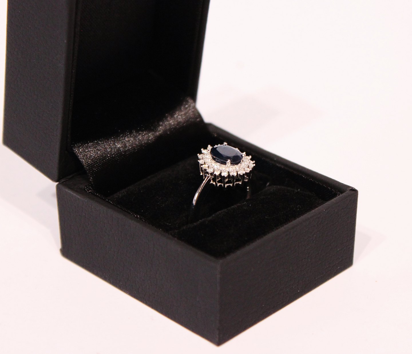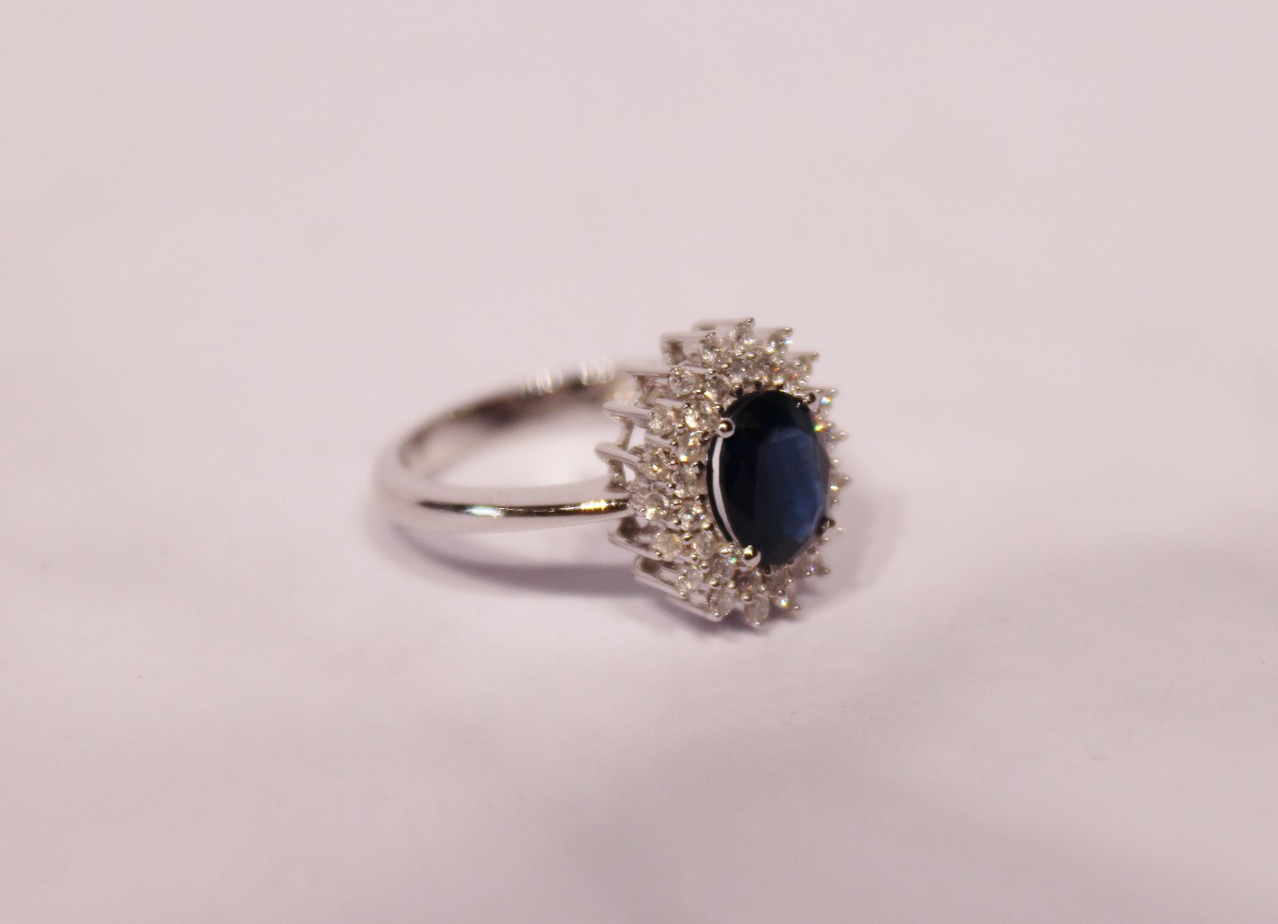 SoldWhite gold ring with 1,9 ct. ovale saphire and 36 diamonds, clarity P1-P2 Wesselton.