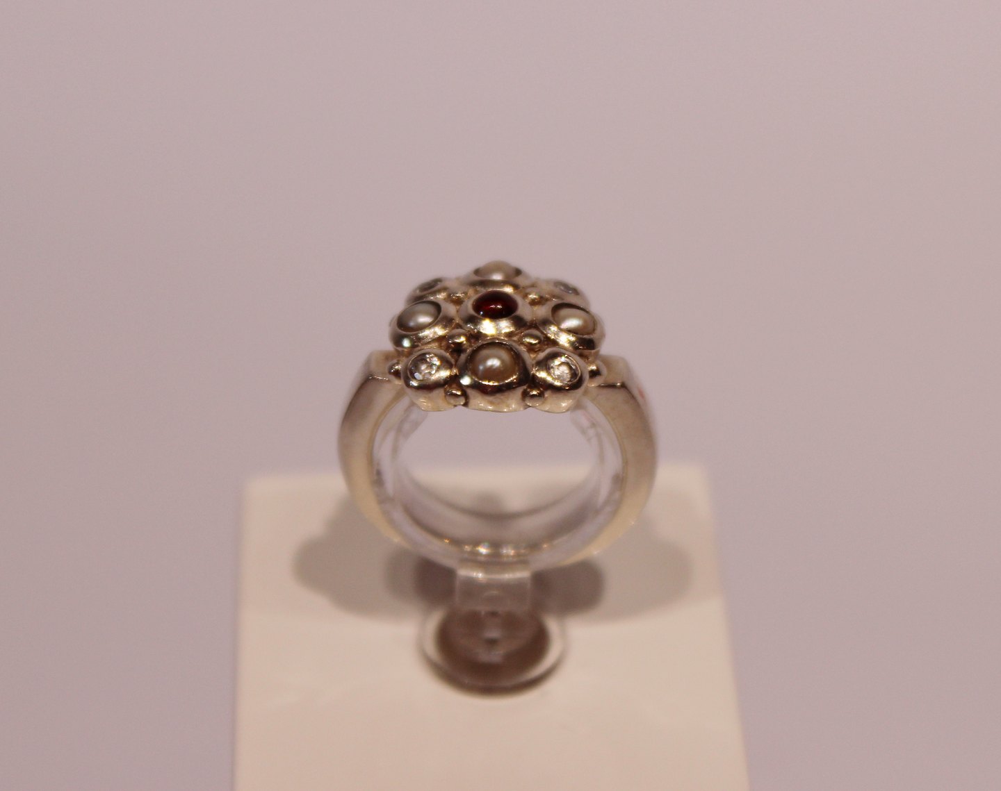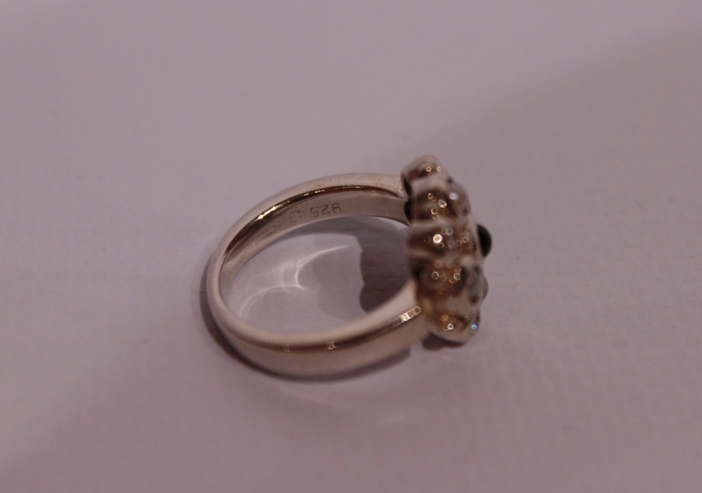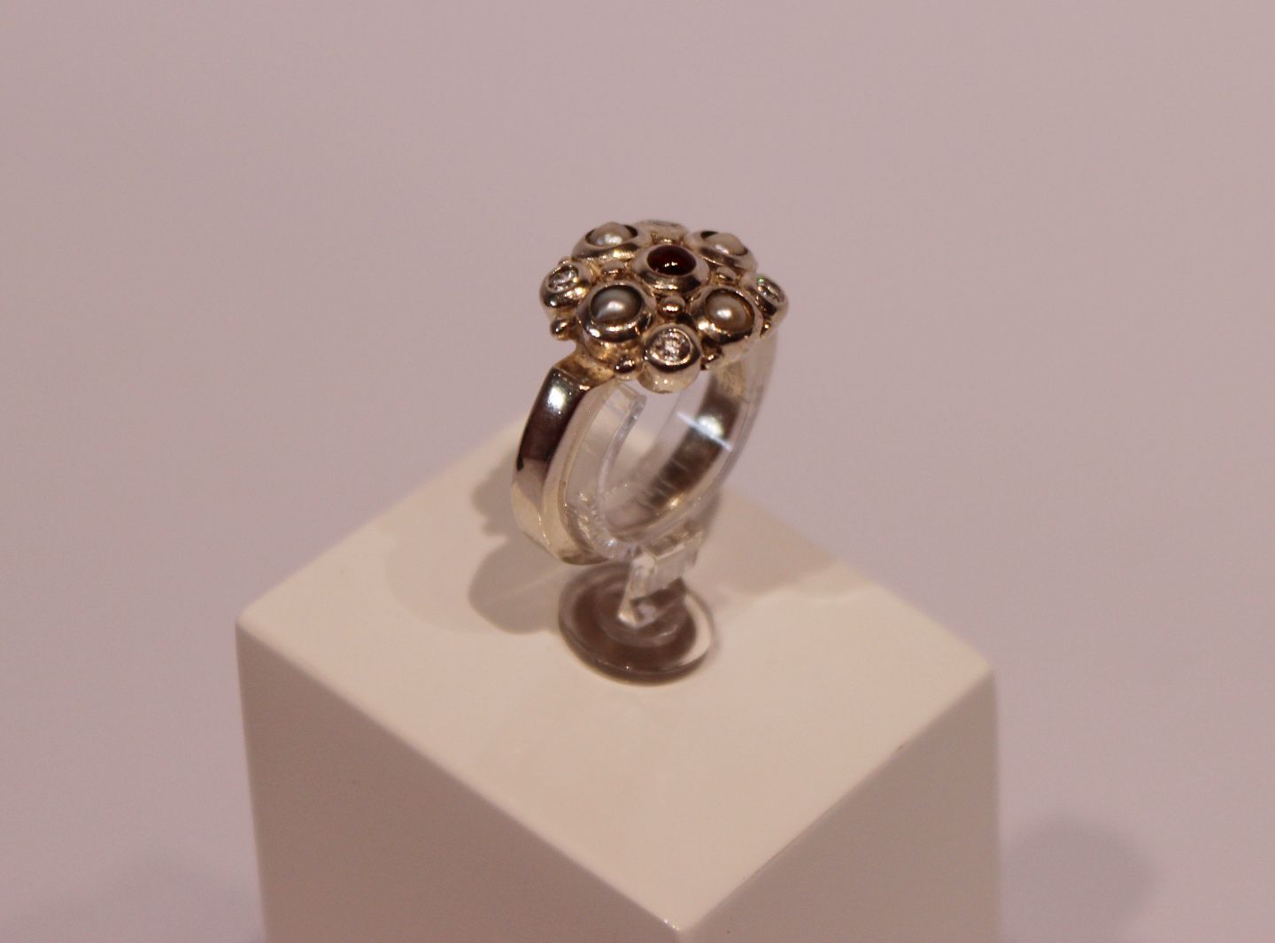 SolgtRing med rav, perlemor og zirkoner, stemplet JAR og i 925 sterling sølv.