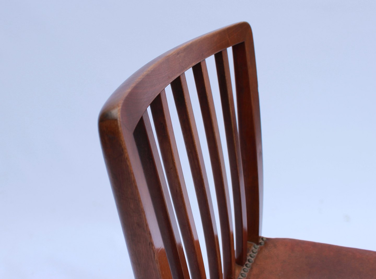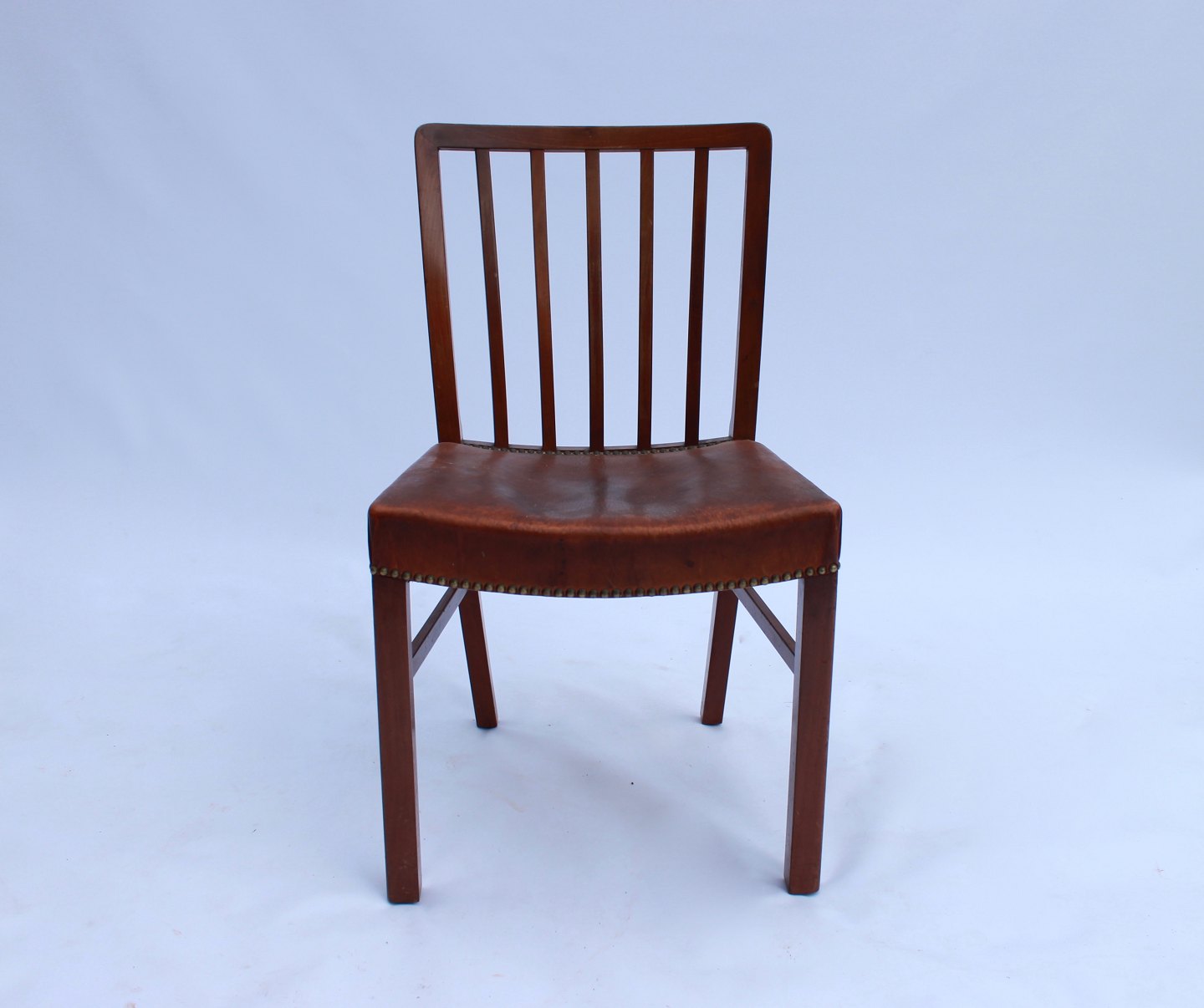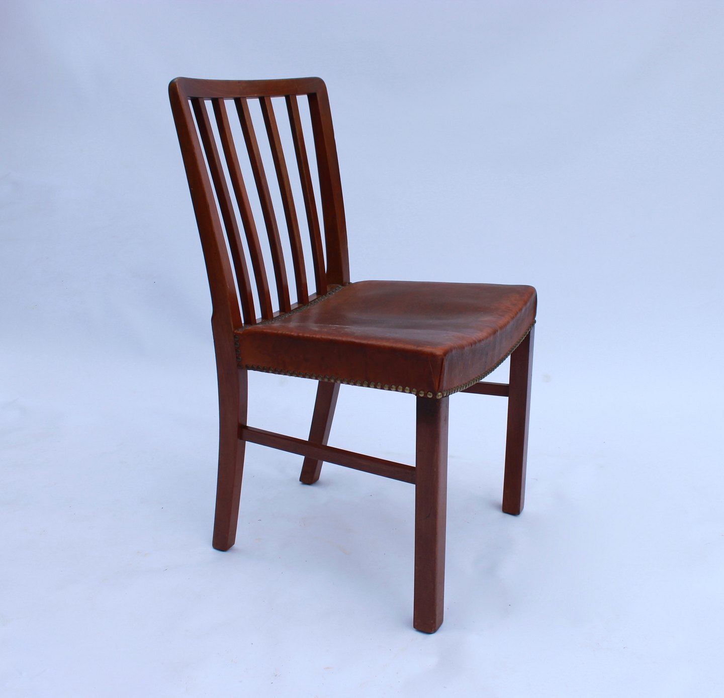 SolgtSæt af 6 spisestuestole i lys mahogni og originalt polstret med patineret læder af Fritz Hansen fra 1940erne. Stolene er i flot brugt stand.