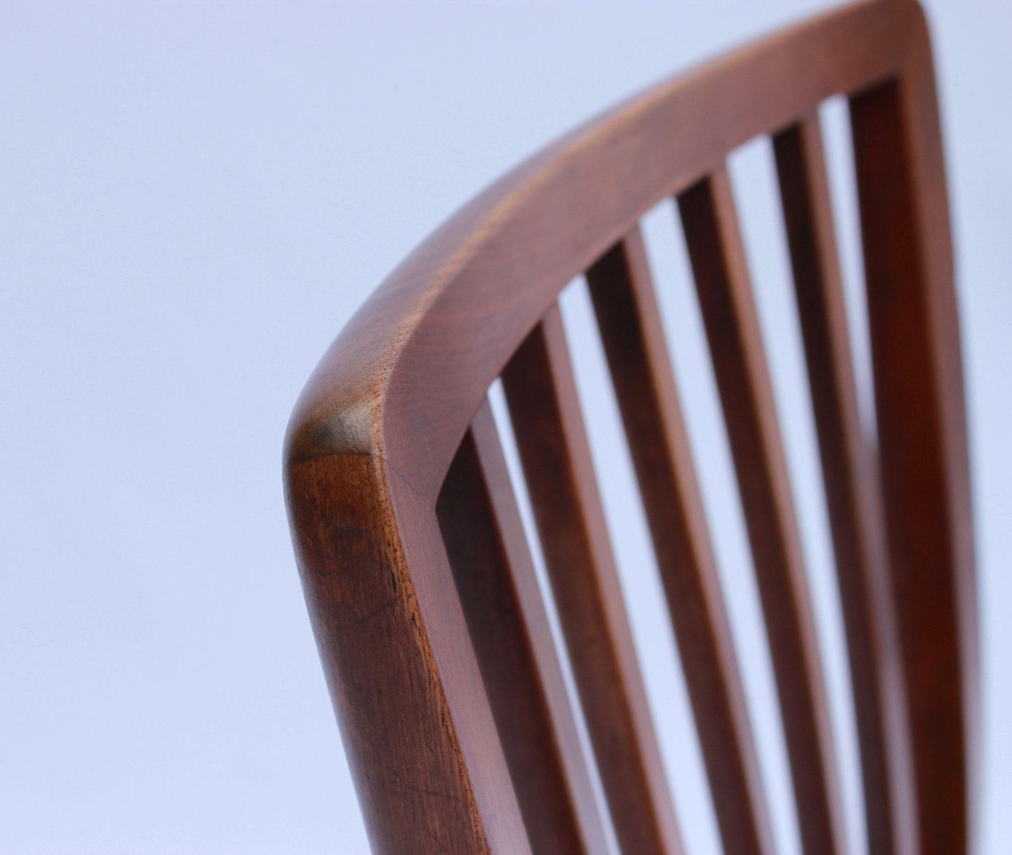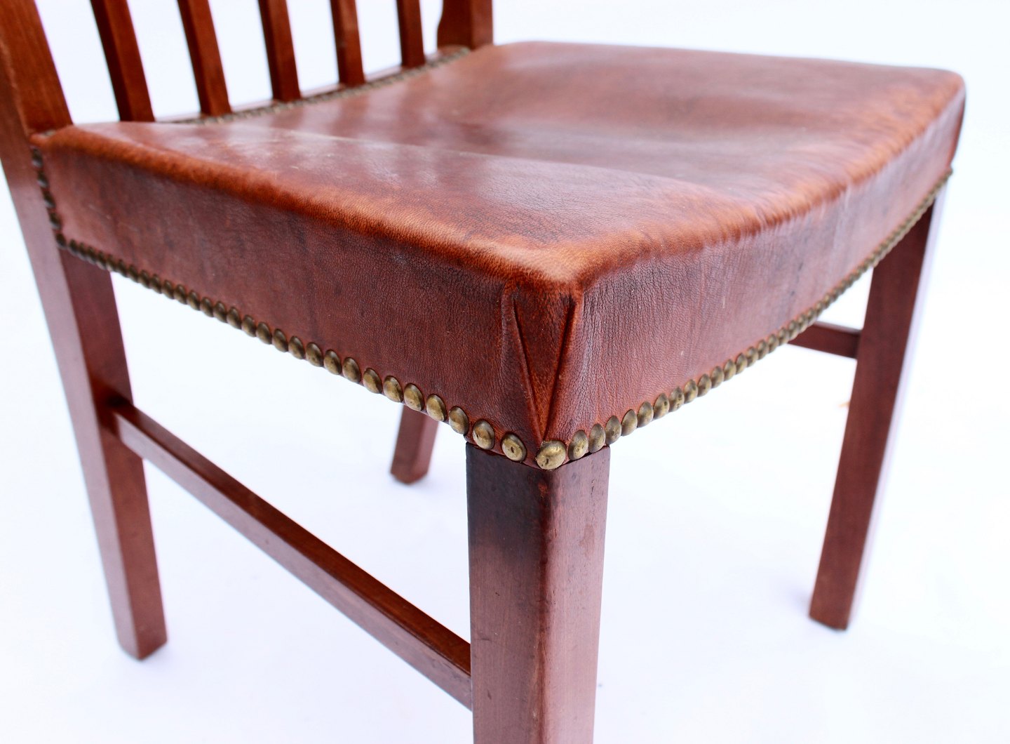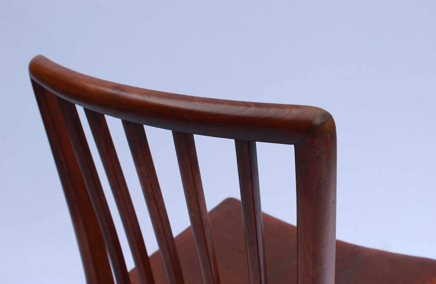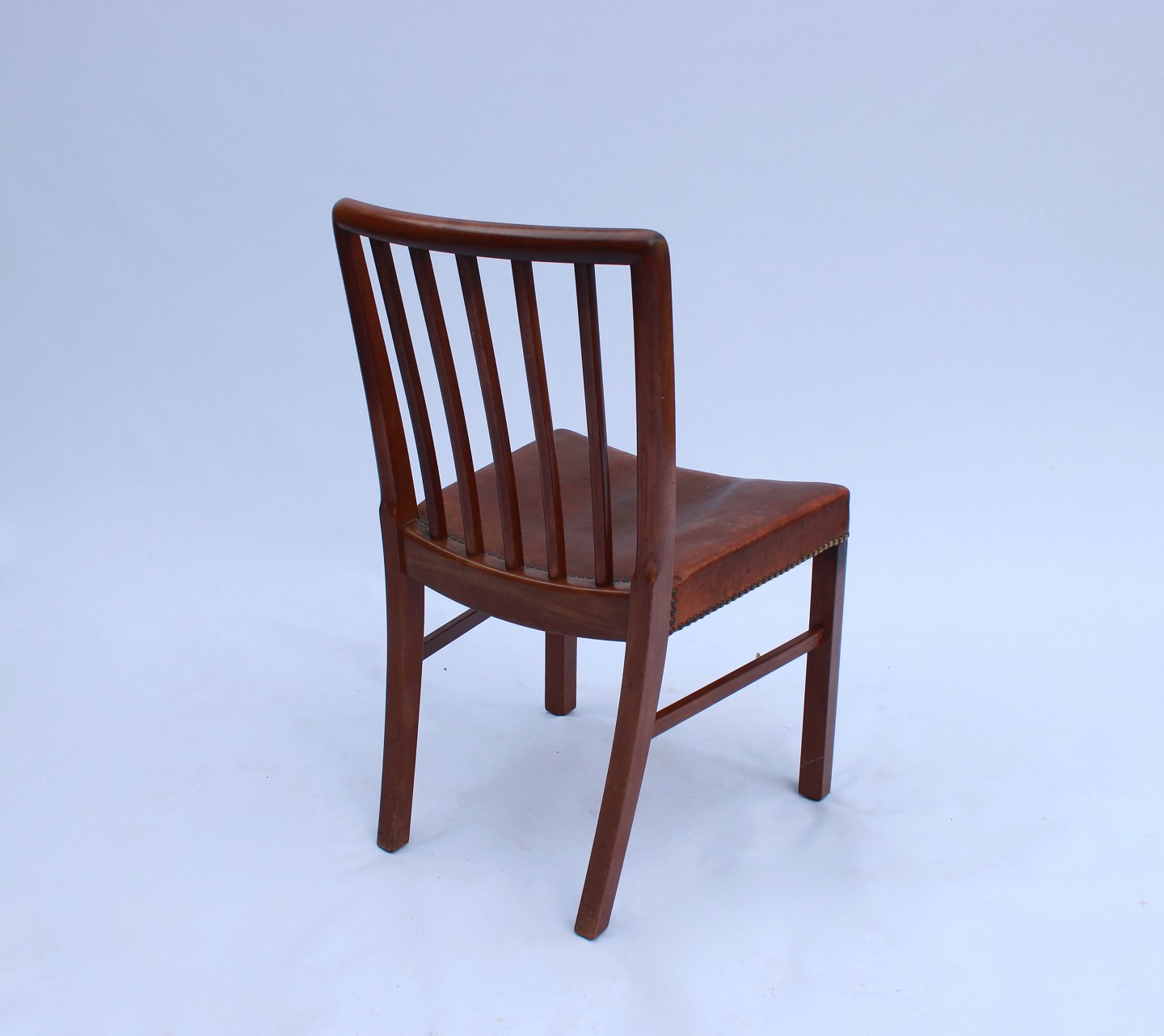 SolgtSæt af 6 spisestuestole i lys mahogni og originalt polstret med patineret læder af Fritz Hansen fra 1940erne. Stolene er i flot brugt stand.