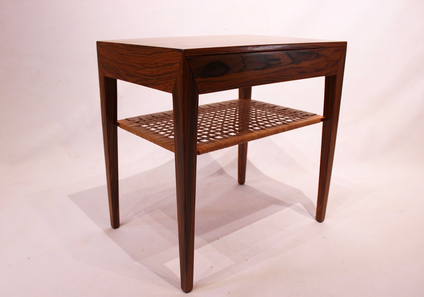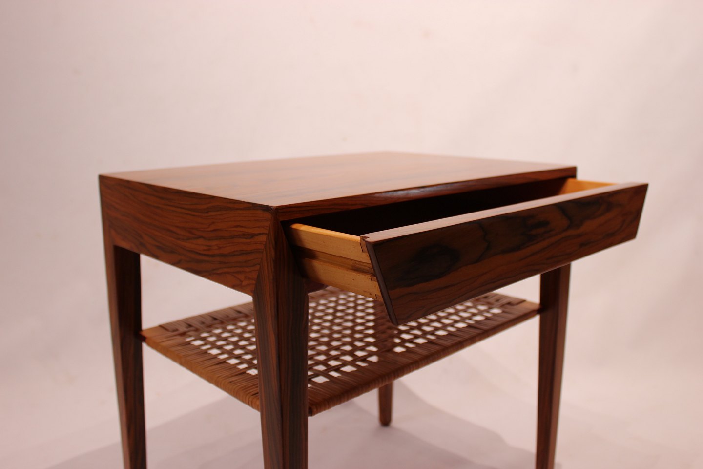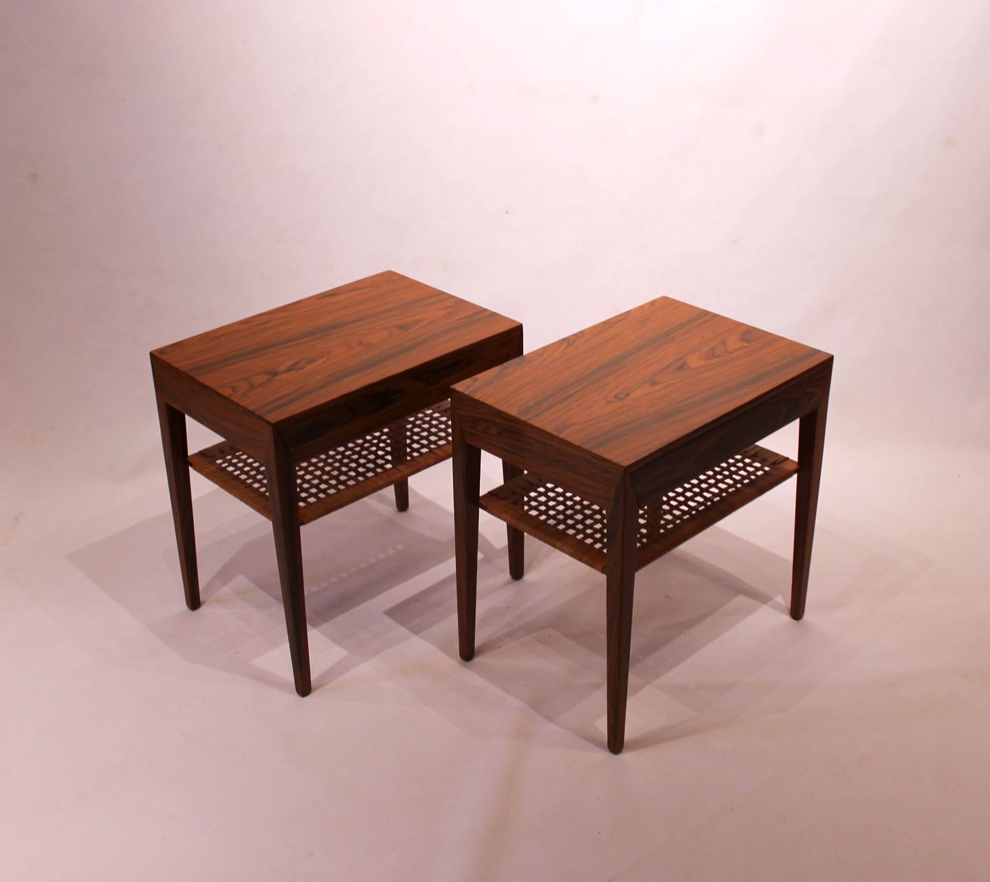 SoldA set of bedside tables in rosewood and papercord shelf designed by Severin Hansen and manufactured by Haslev furniture factory in the 1960s. The tables are in great vintage condition.